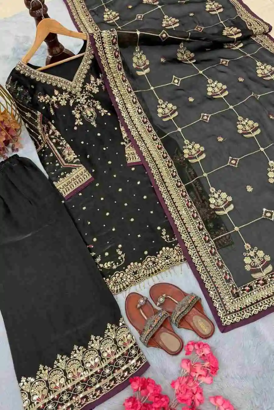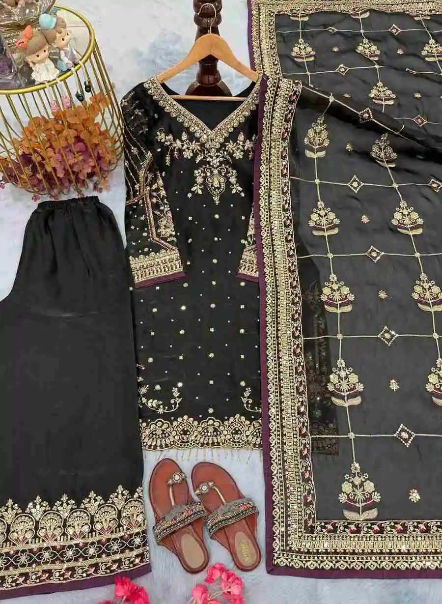 PALAZZO FABRIC :- HEAVY FAUX GEORGETTE WITH 5MM EMBROIDERY SEQUENCE WITH FULLY FLAIR