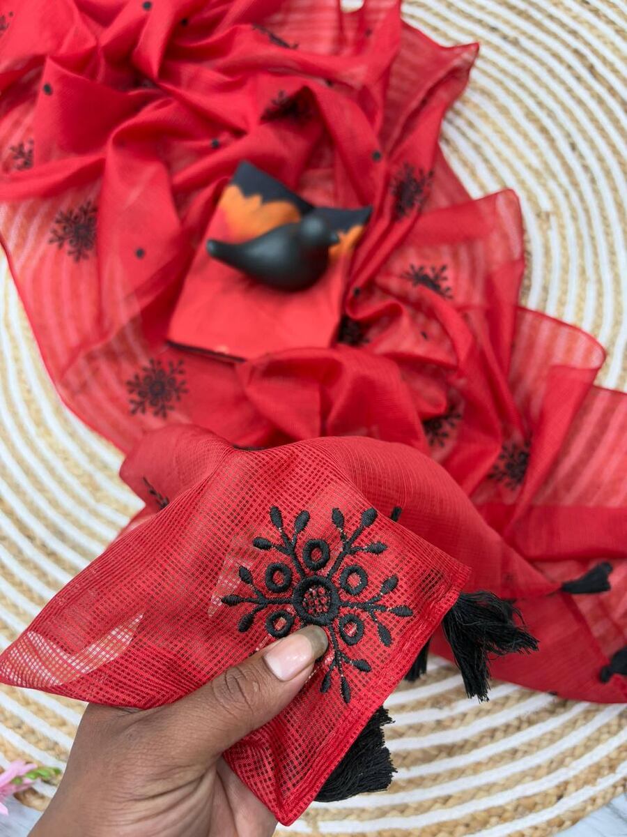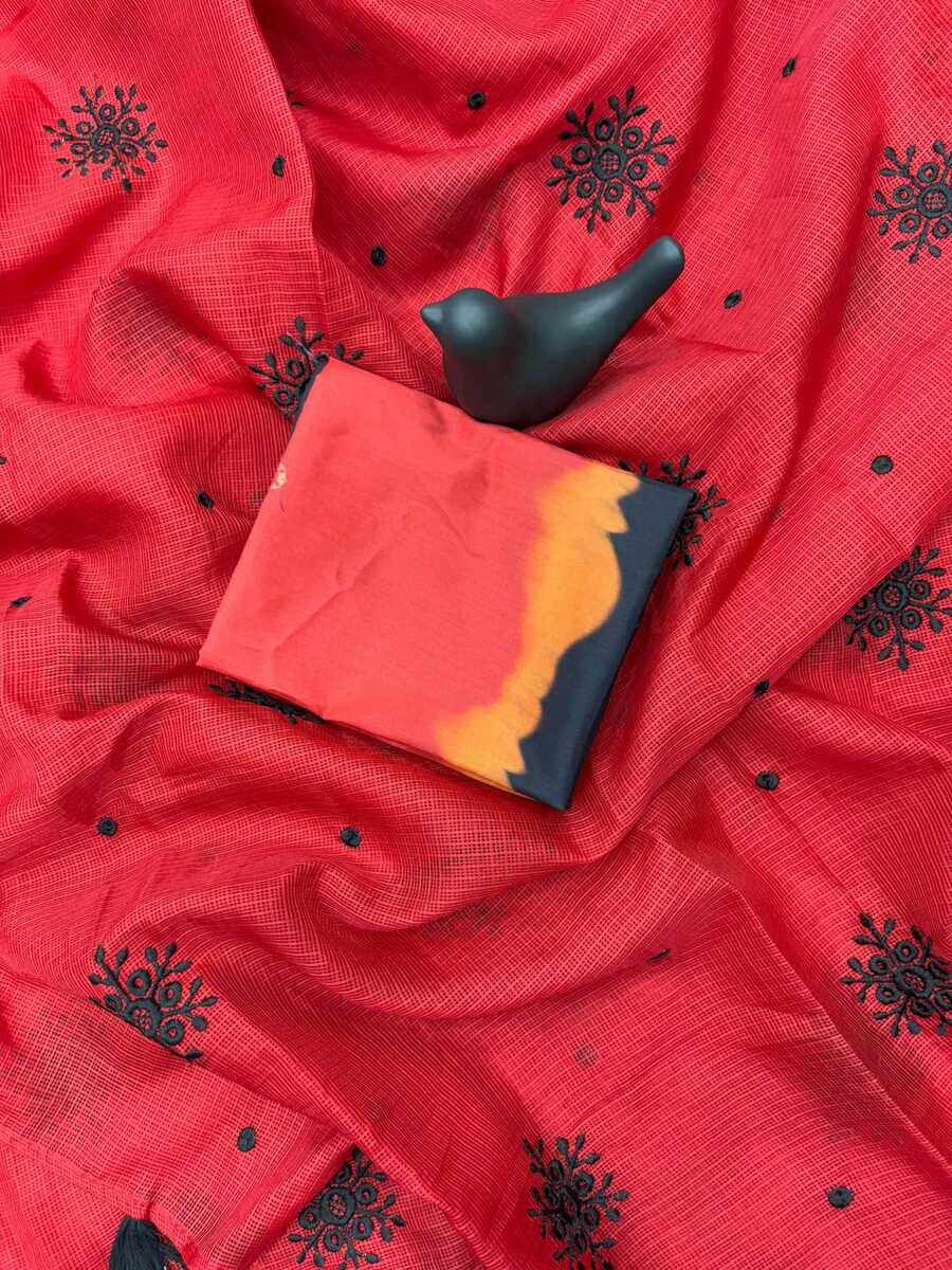 LATEST KOTA DORIYA WEAVING CHECKS PATTERN WITH EMBROIDERY WORK SAREE WITH UNSTITCHED BLOUSE RED