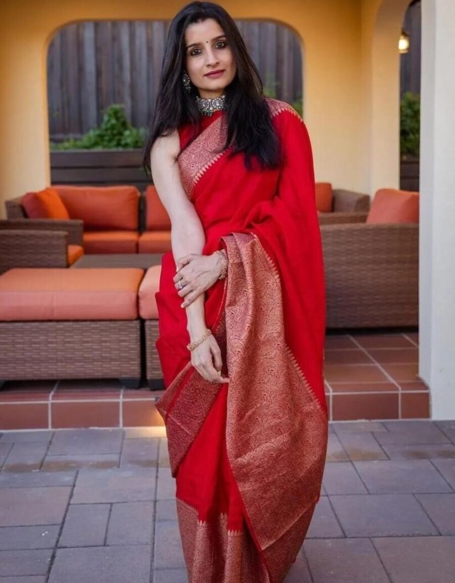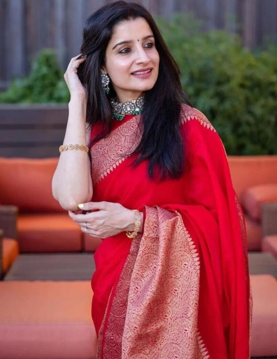 LATEST LICHI SILK JACQUARD WORK SAREE WITH UNSTITCHED BLOUSE RED