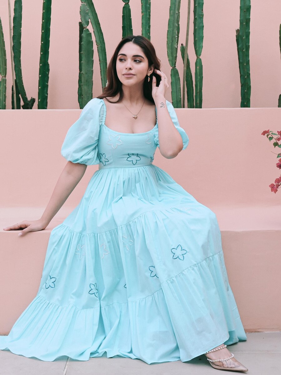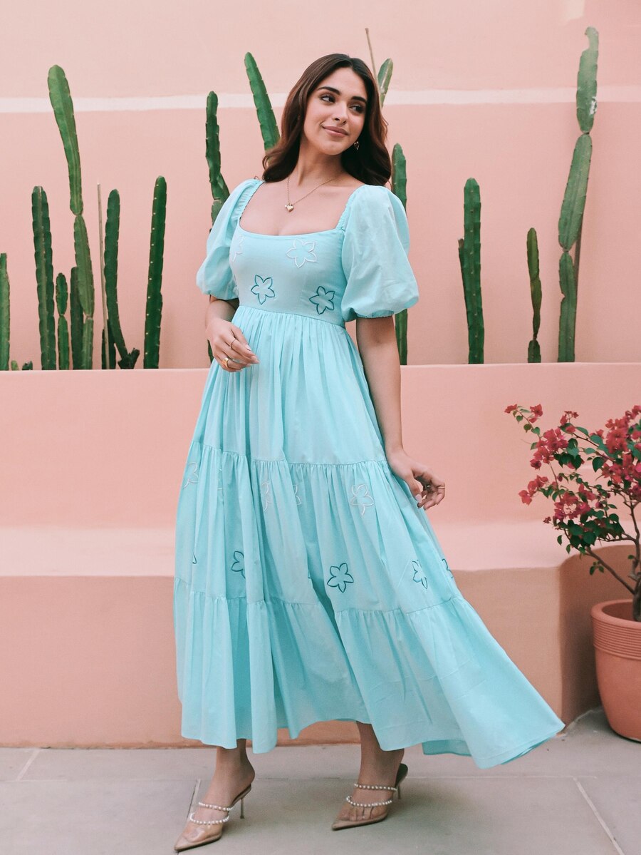 LATEST MUL MUL COTTON EMBROIDERY WORK ONE PEICE DRESS SKY