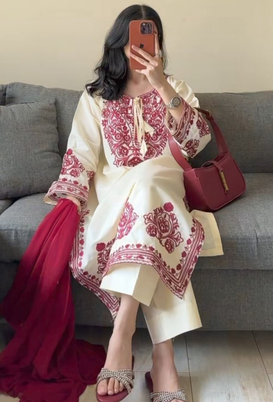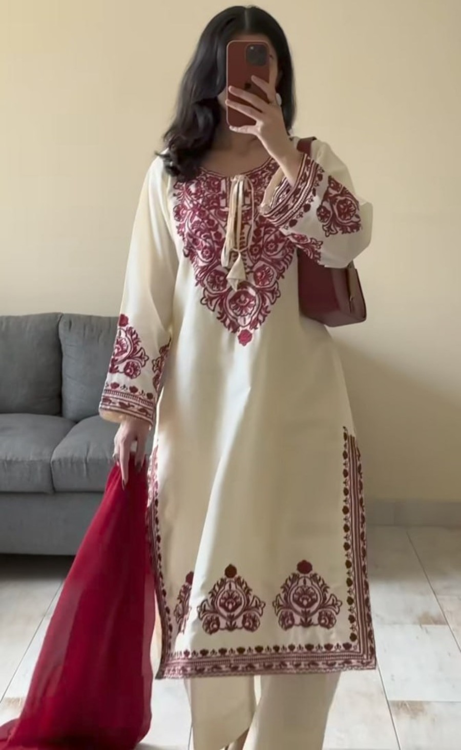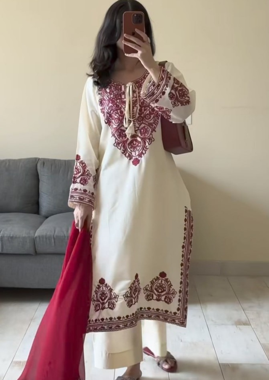 LATEST NATURAL CREPE EMBROIDERY WITH THREAD WORK TOP BOTTOM WITH DUPATTA OFF WHITE