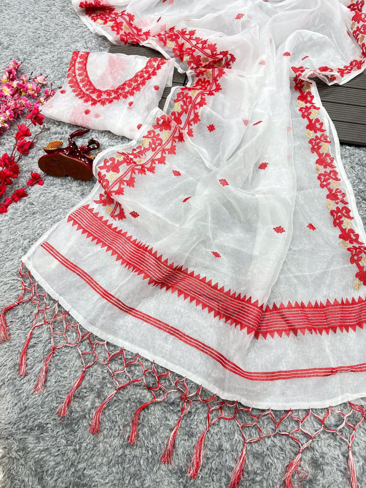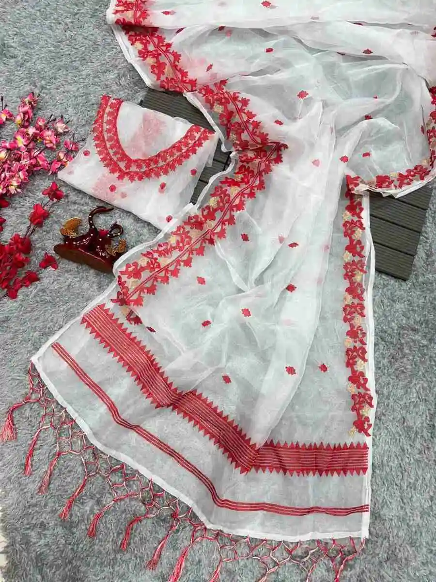 LATEST ORGANZA EMBRODERY MULTI THREAD WORK SAREE WITH UNSTITCHED BLOUSE WHITE