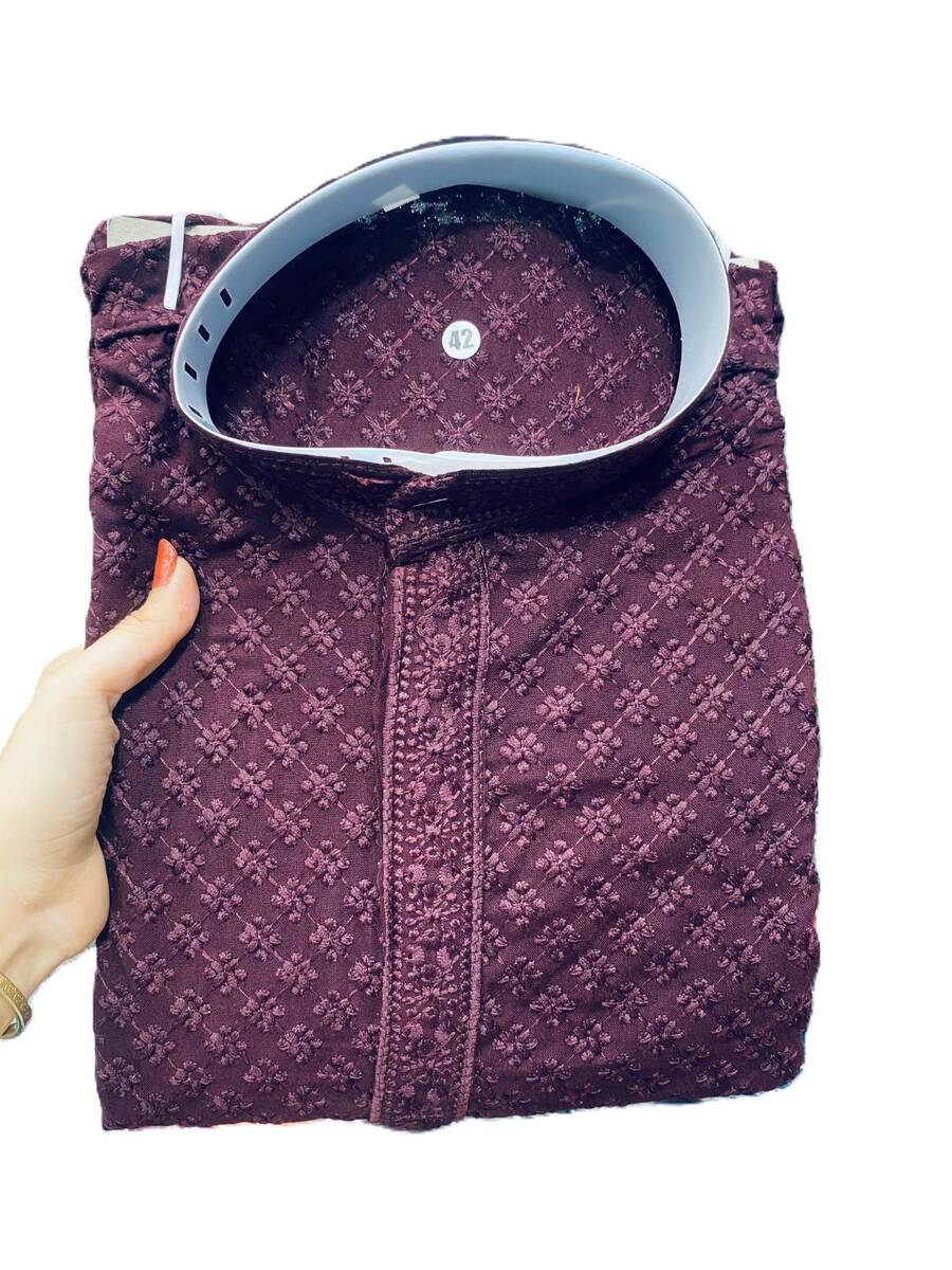 LATEST RAYON EMBROIDERY WORK MEN’S KURTA PAYJAMA WINE