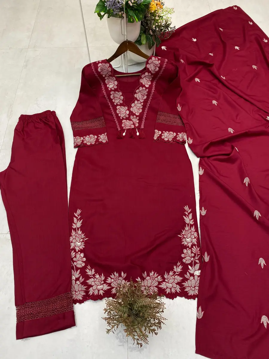 LATEST RAYON SLUB COTTON EMBROIDERY WITH KODI LATKAN LACE WORK TOP BOTTOM WITH DUPATTA MAROON