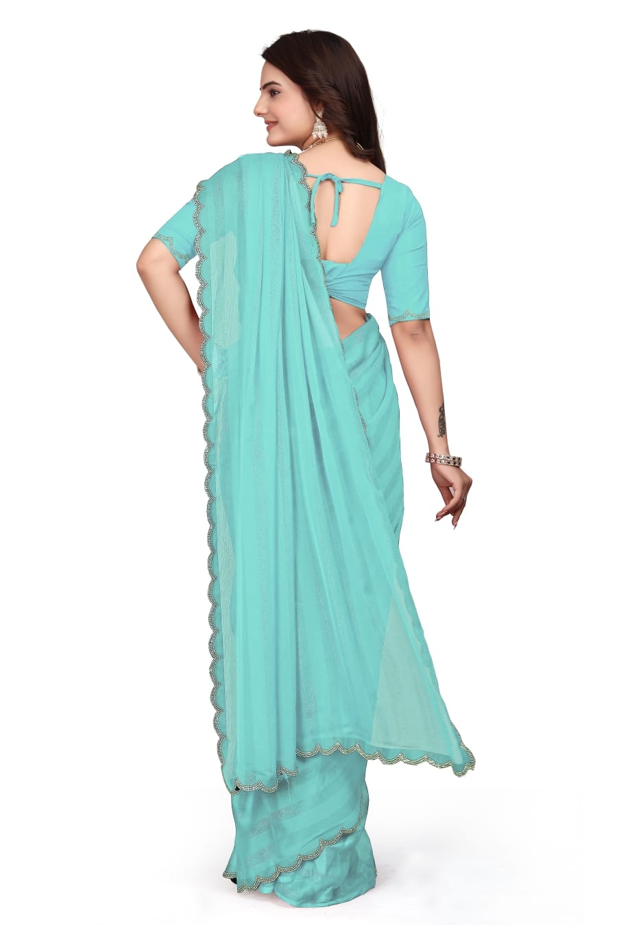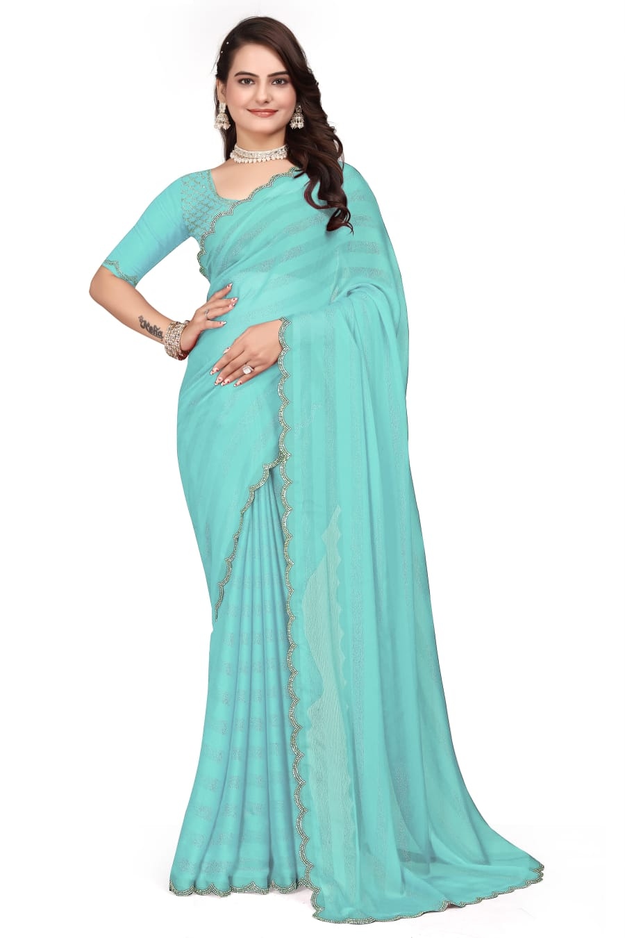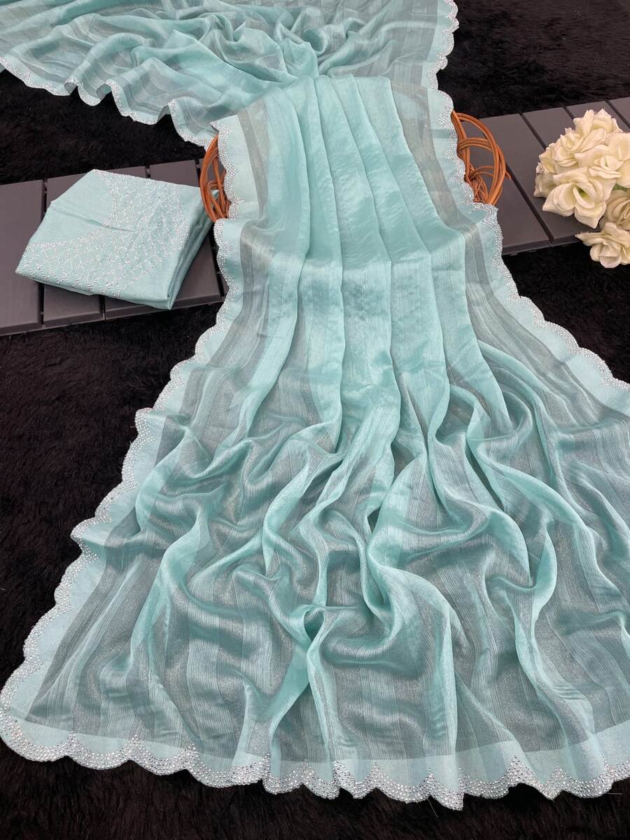 LATEST RIMZIM PATTA HOT FIX SAREE WITH UNSTITCHED BLOUSE SKY