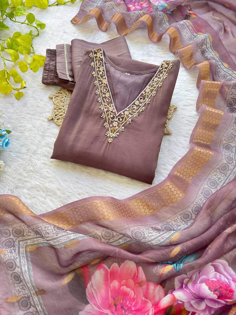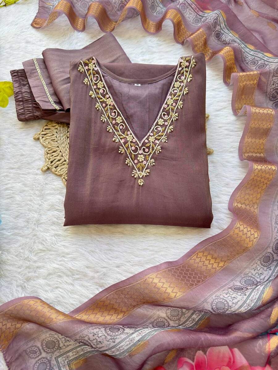 LATEST ROMAN SHIMMER SILK HANDWORK TOP BOTTOM WITH DUPATTA VIOLET