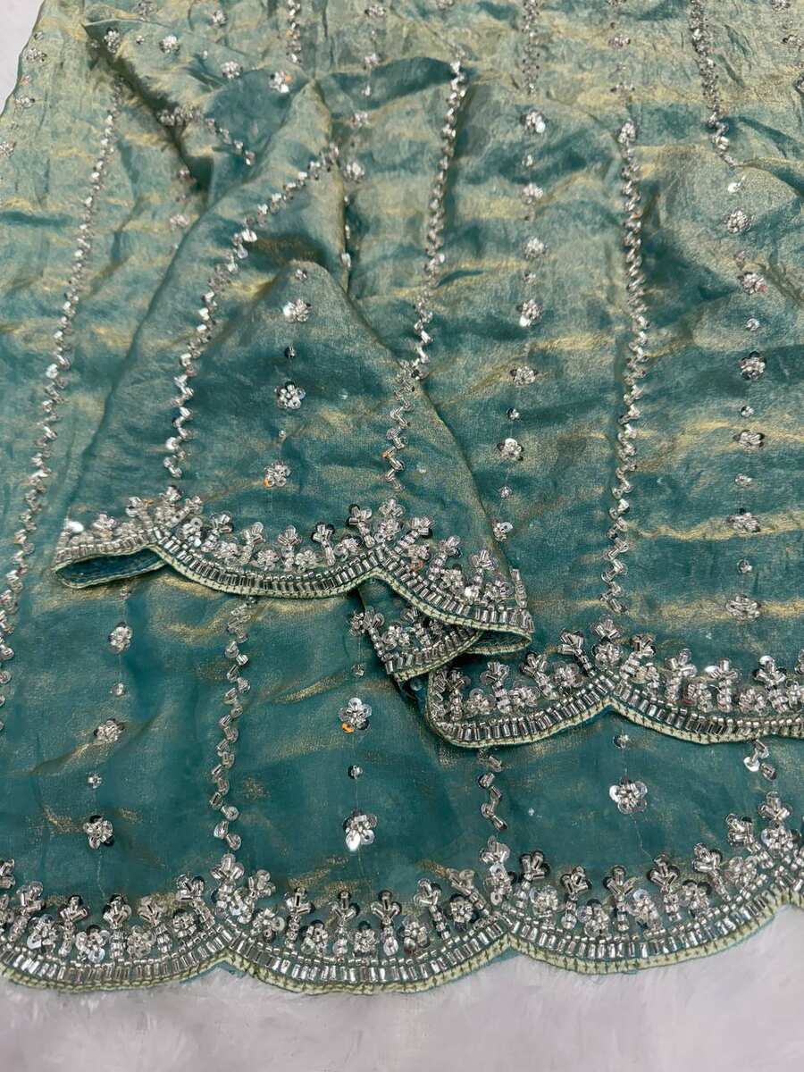 LATEST SPACE SILK BEADS AND SEQUENCE EMBROIDERY WORK SAREE WITH UNSTITCHED BLOUSE SKY