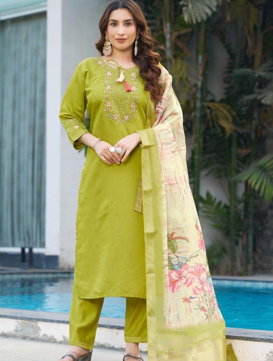 LATEST VISCOSE SILK MULTI EMBROIDERY THREAD, WITH HAND WORK TOP BOTTOM WITH DUPATTA GREEN