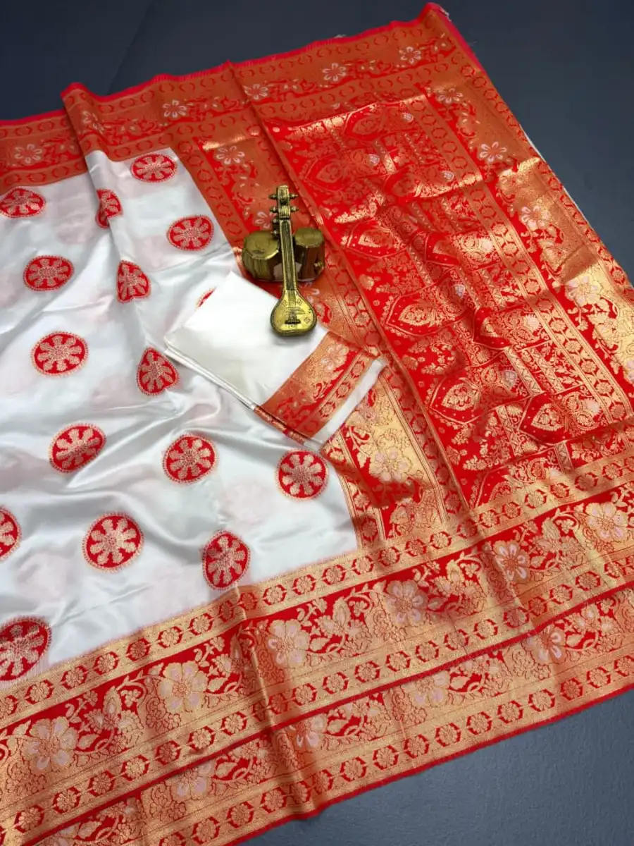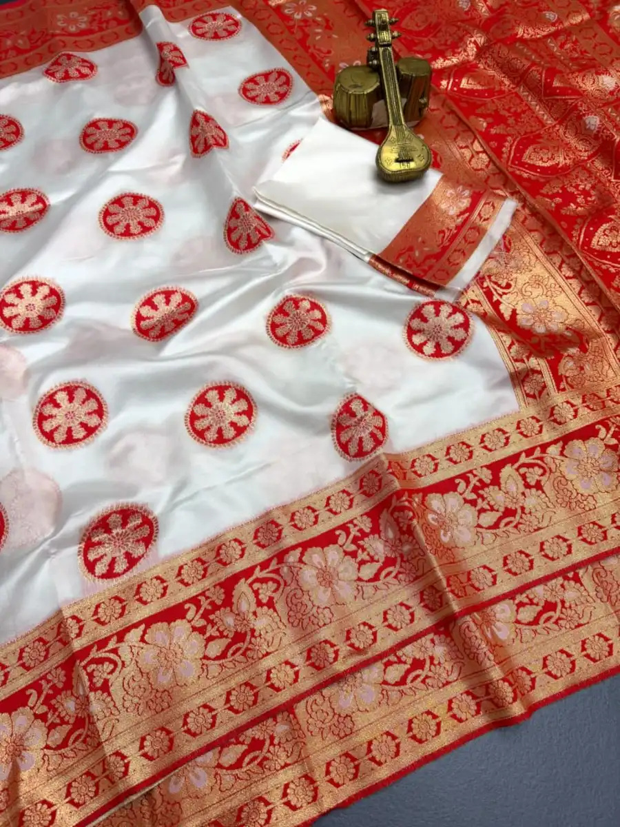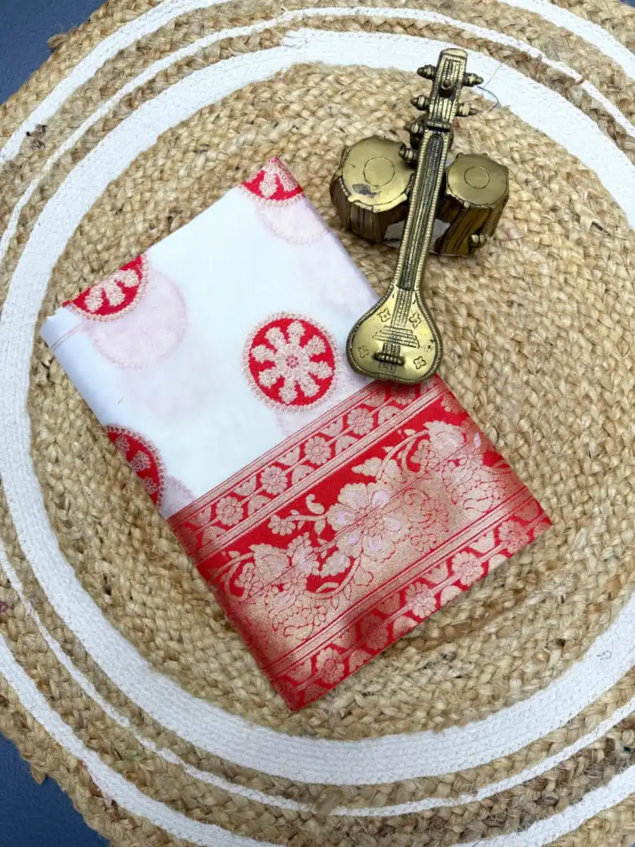 MODERN BANARASI SILK ZARI WEAVING RICH PALLU WITH ZARI WEAVING UNIQUE BORDER WORK SAREE WITH UNSTITCHED BLOUSE WHITE AND RED