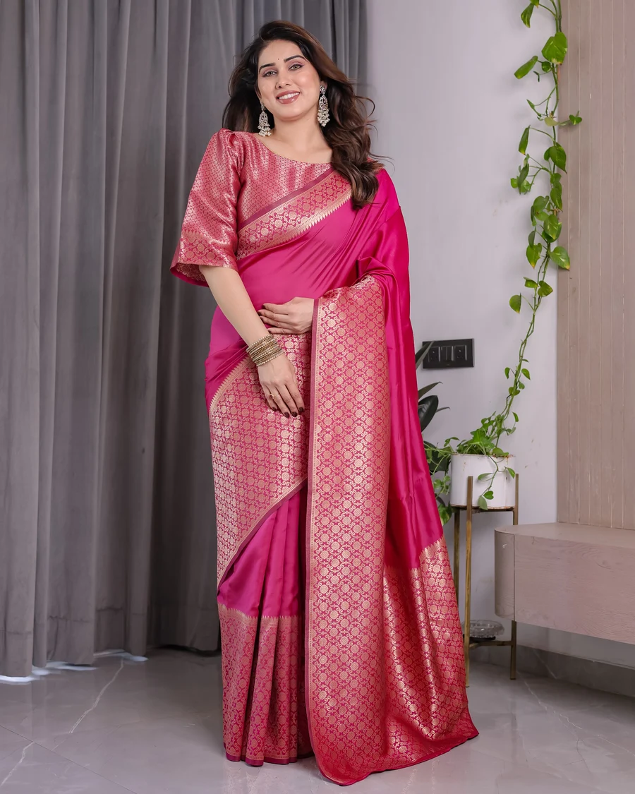 MODERN BANARASI SILK ZARI WOVEN WORK SAREE WITH UNSTITCHED BLOUSE PINK