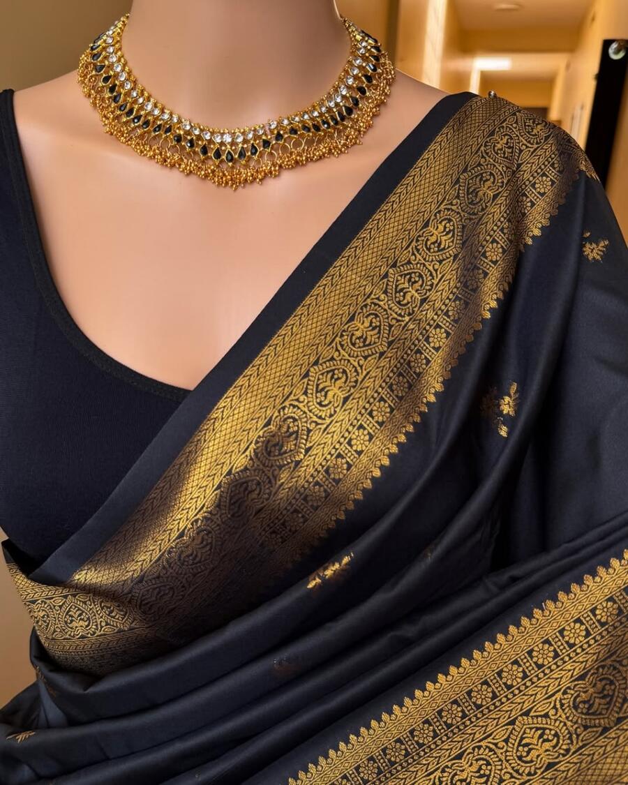 MODERN BANARASI SOFT SILK WEAVING WORK SAREE WITH UNSTITCHED BLOUSE BLACK