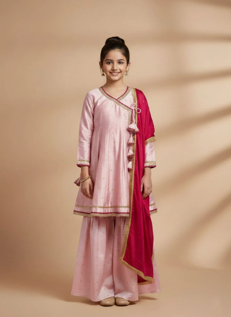 MODERN CHANDERI COTTON EMBROIDERED LACE WORK KID’S TOP BOTTOM WITH DUPATTA BABY PINK