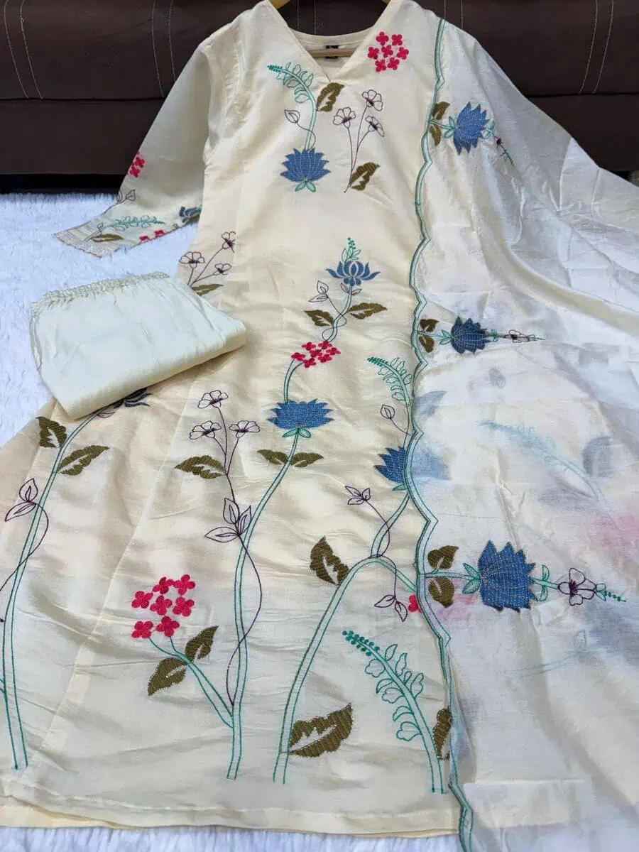 MODERN CHANDERI COTTON EMBROIDERY WORK TOP BOTTOM WITH DUPATTA OFF WHITE