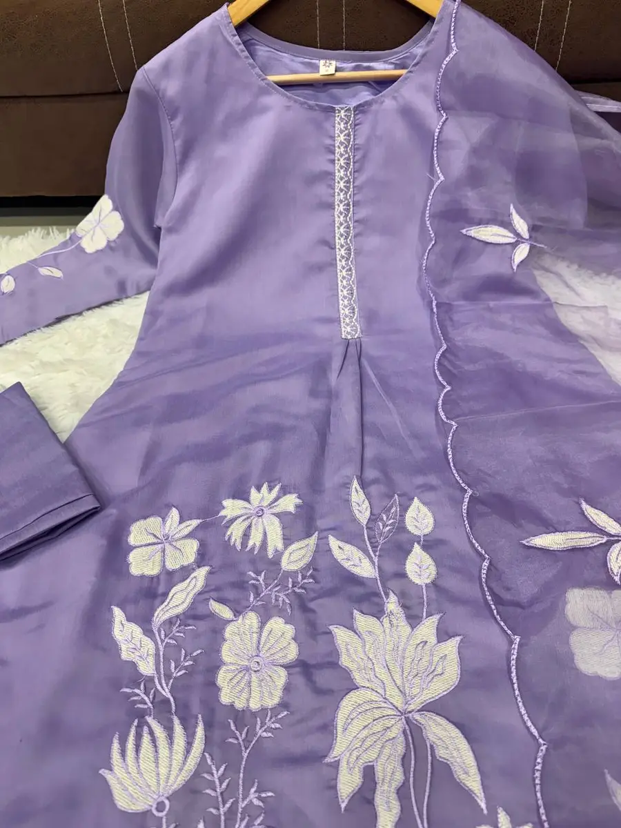 MODERN CHANDERI SILK EMBROIDERY WORK TOP BOTTOM WITH DUPATTA LAVENDER
