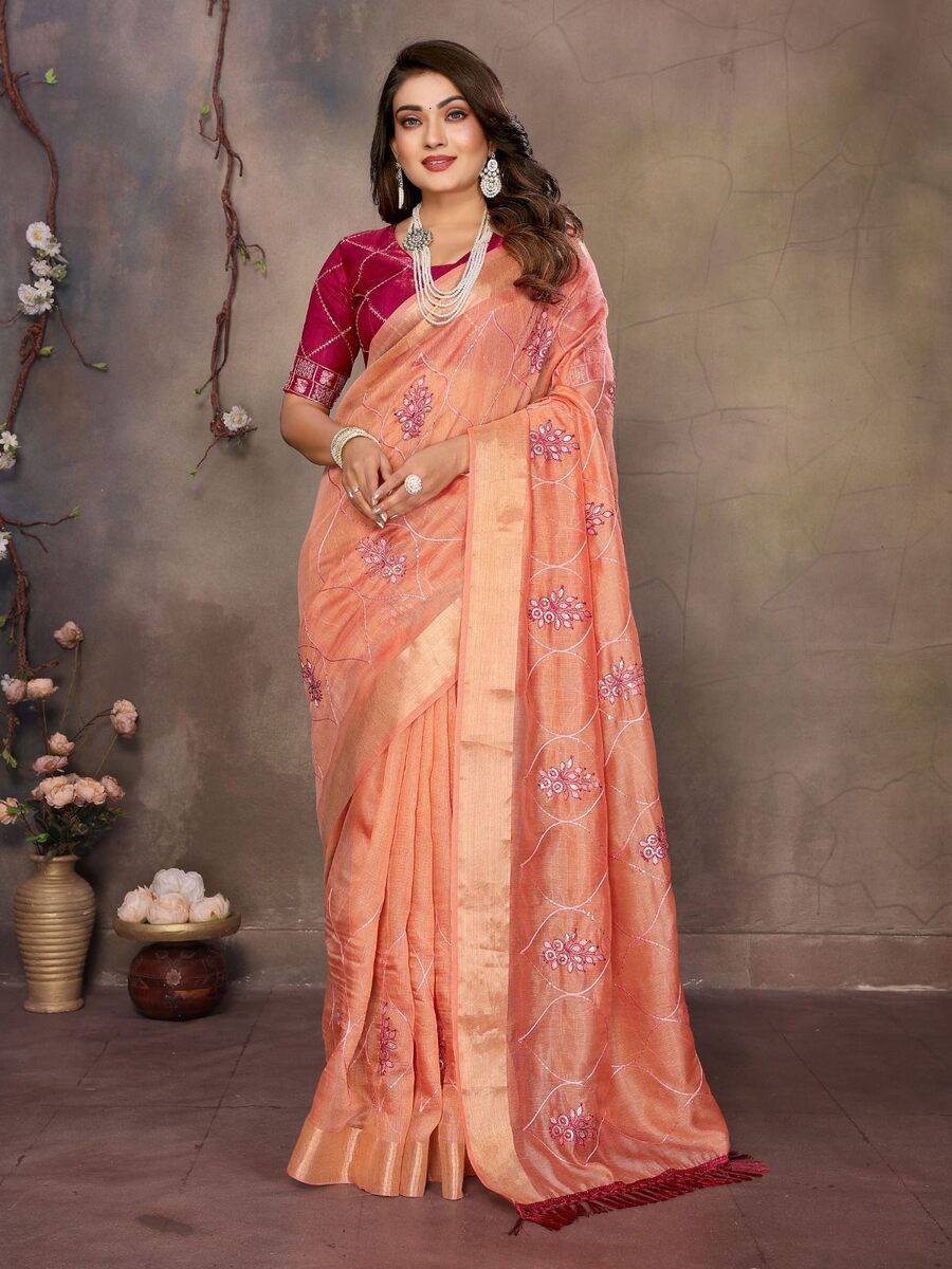 MODERN CHIFFON NET EMBROIDERY WITH SEQUENCE WORK SAREE WITH UNSTITCHED BLOUSE PEACH