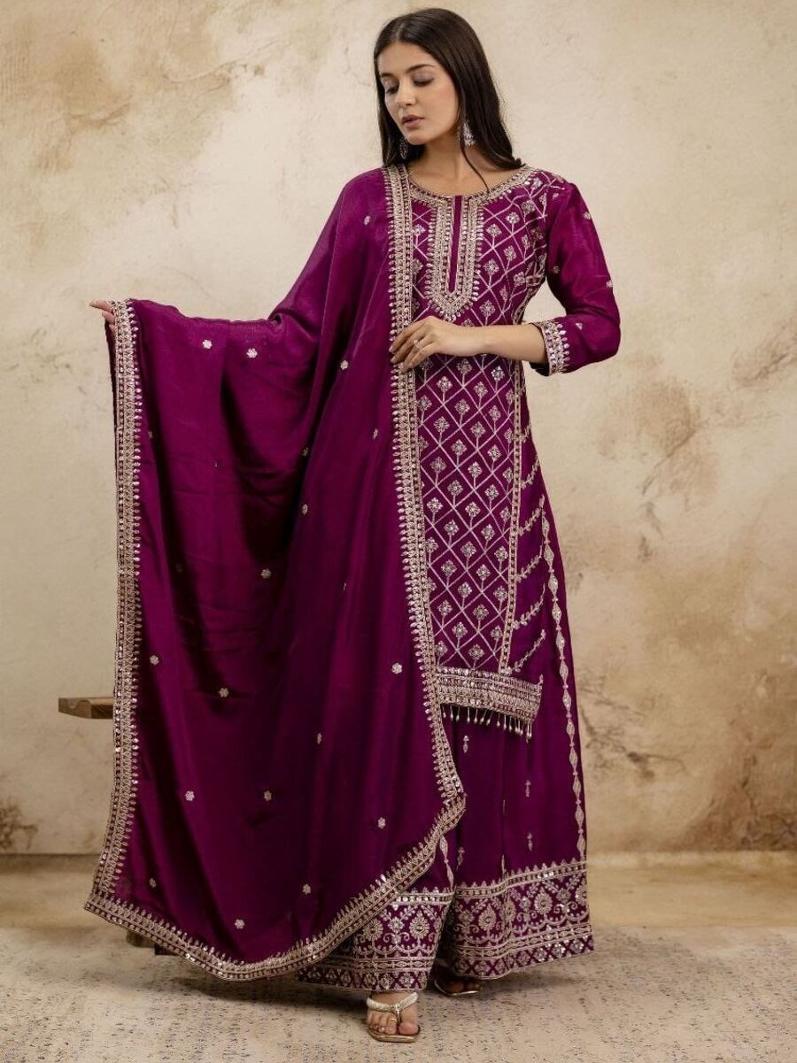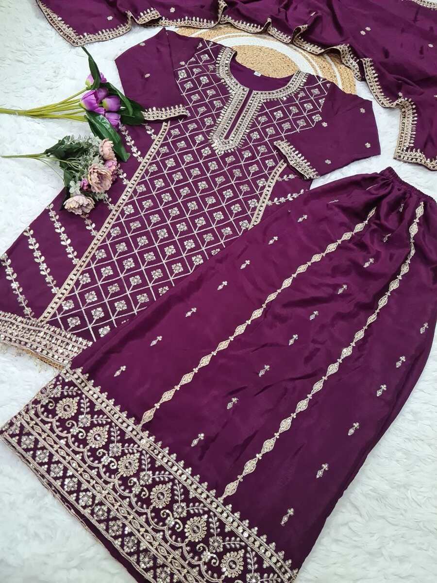 MODERN CHINON CODING SEQUENCE EMBROIDERY WORK TOP PALAZZO WITH DUPATTA WINE