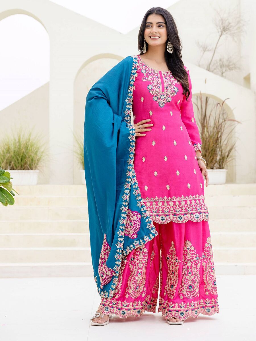 MODERN CHINON EMBROIDERY SEQUENCE CODING DESIGN WORK TOP PALAZZO WITH DUPATTA PINK