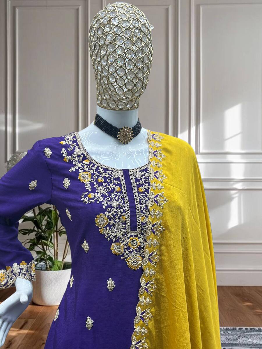 MODERN CHINON EMBROIDERY SEQUENCE CODING DESIGN WORK TOP PALAZZO WITH DUPATTA PURPLE