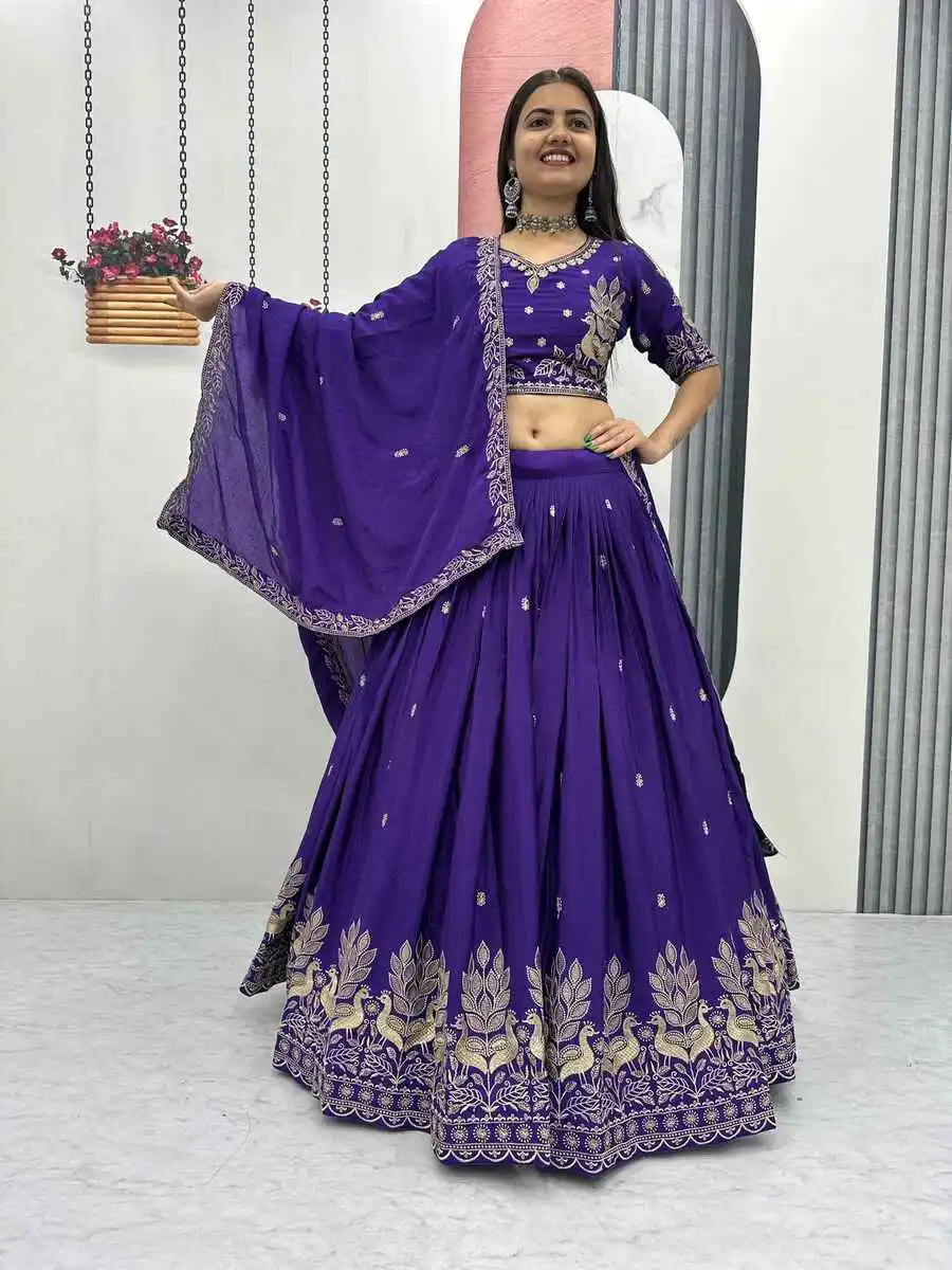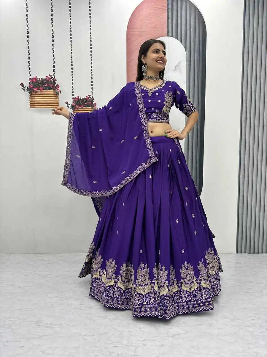 MODERN CHINON EMBROIDERY THREAD WORK LEHENGA CHOLI WITH DUPATTA PURPLE