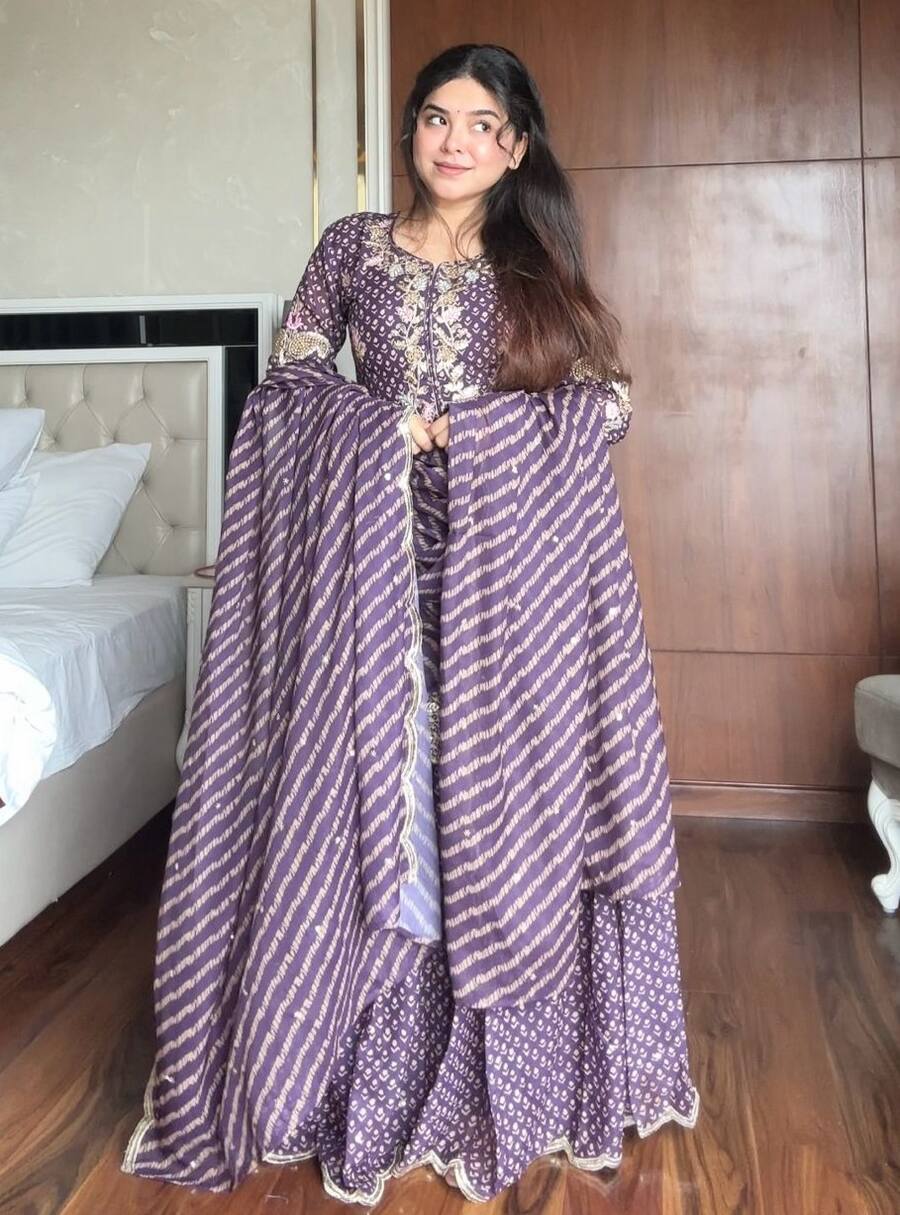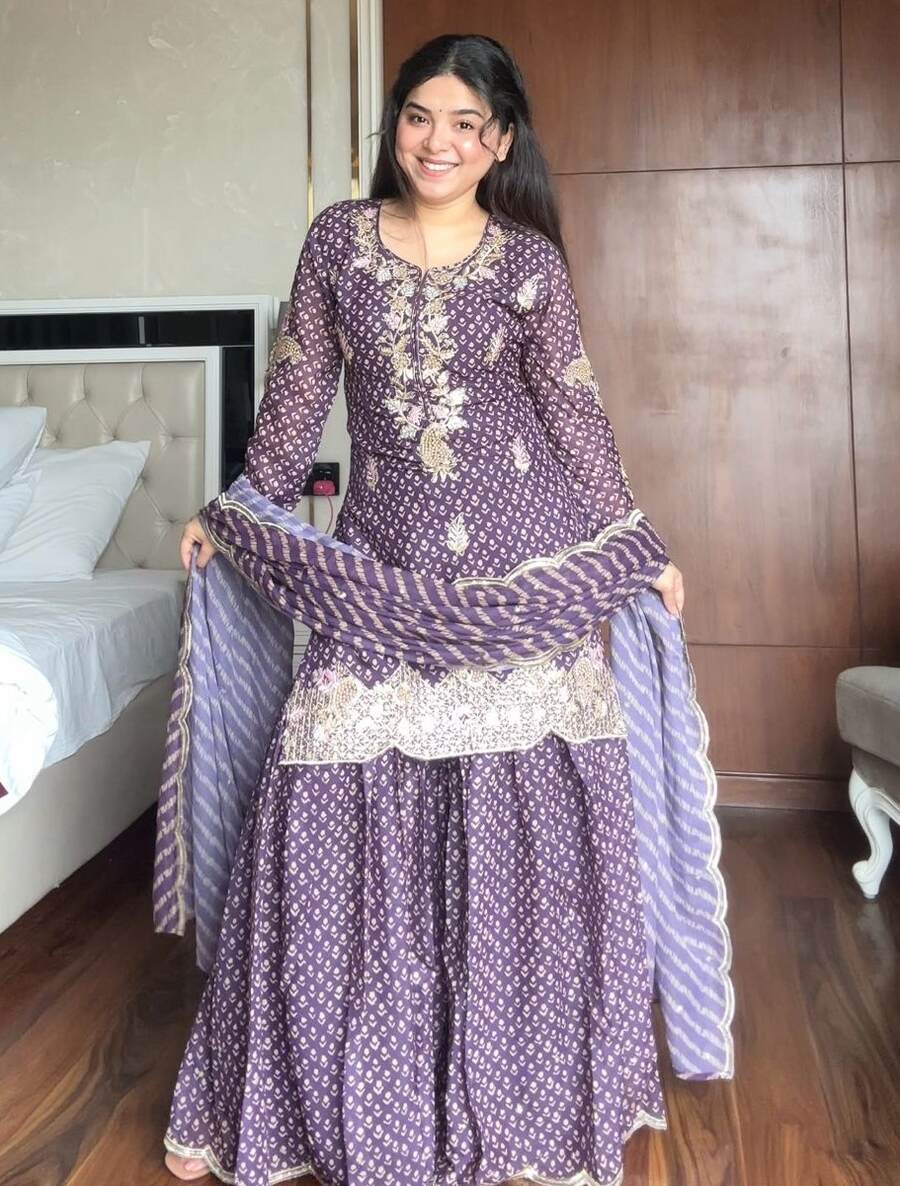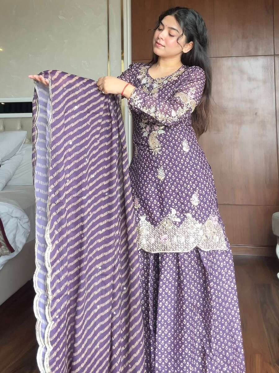 MODERN CHINON PRINT WITH EMBROIDERY AND DIAMOND WORK TOP SHARARA WITH DUPATTA PURPLE