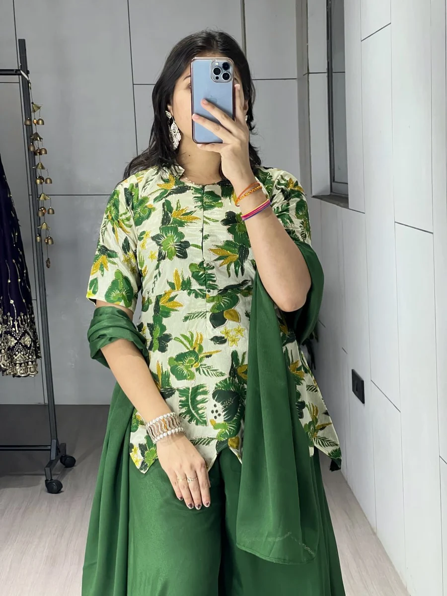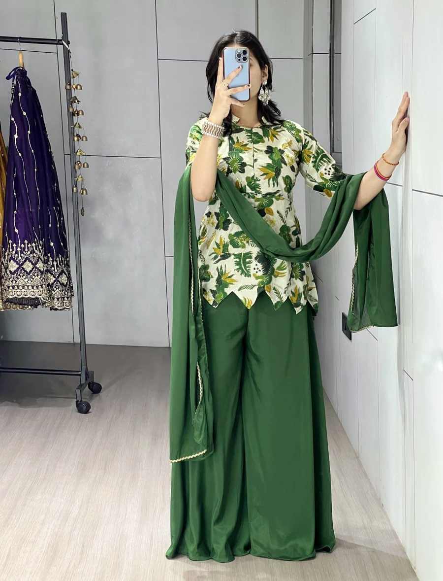 MODERN CHINON PRINT WITH POSITIONED EMBROIDERY WORK TOP PALAZZO WITH DUPATTA GREEN