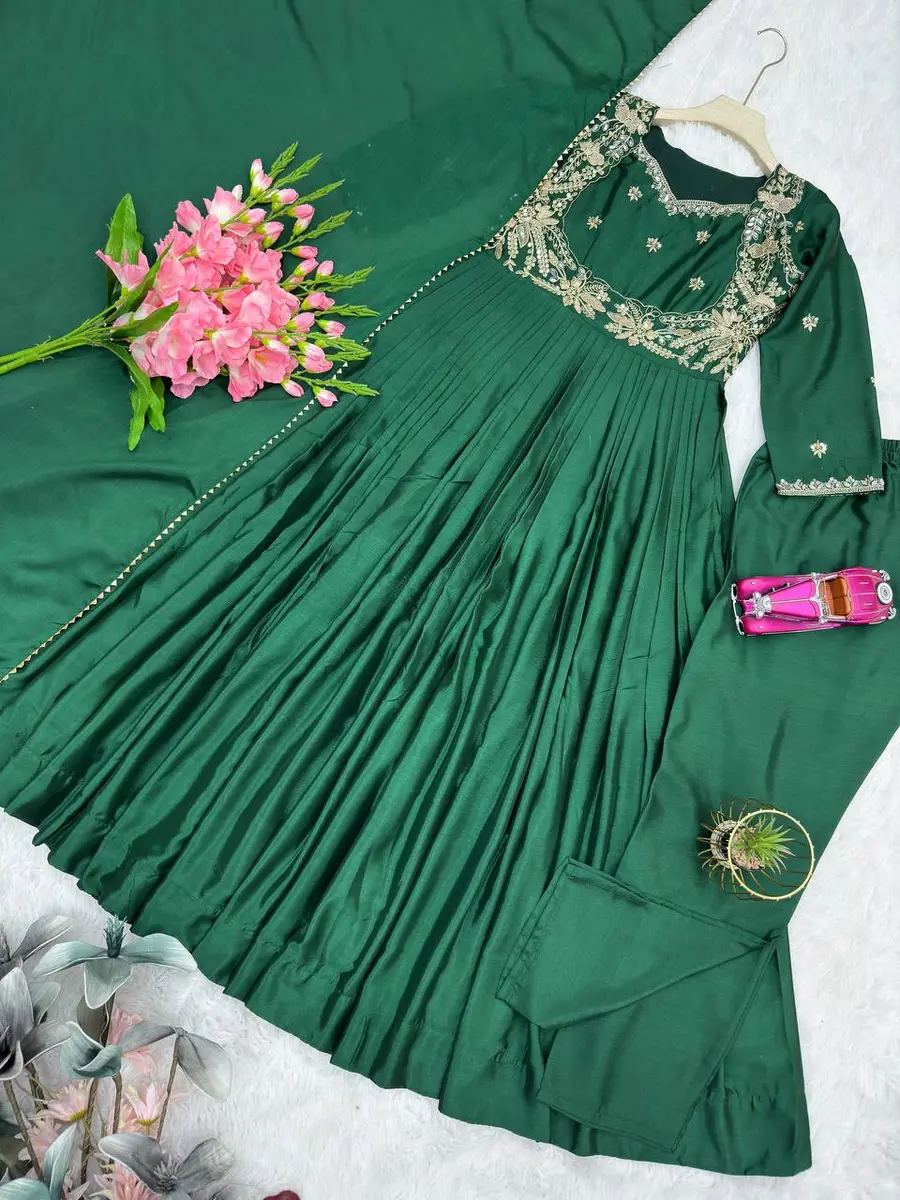 MODERN CHINON SILK EMBROIDERY CODING & SEQUENCE WORK WITH REAL MIRROR WORK GOWN WITH DUPATTA GREEN