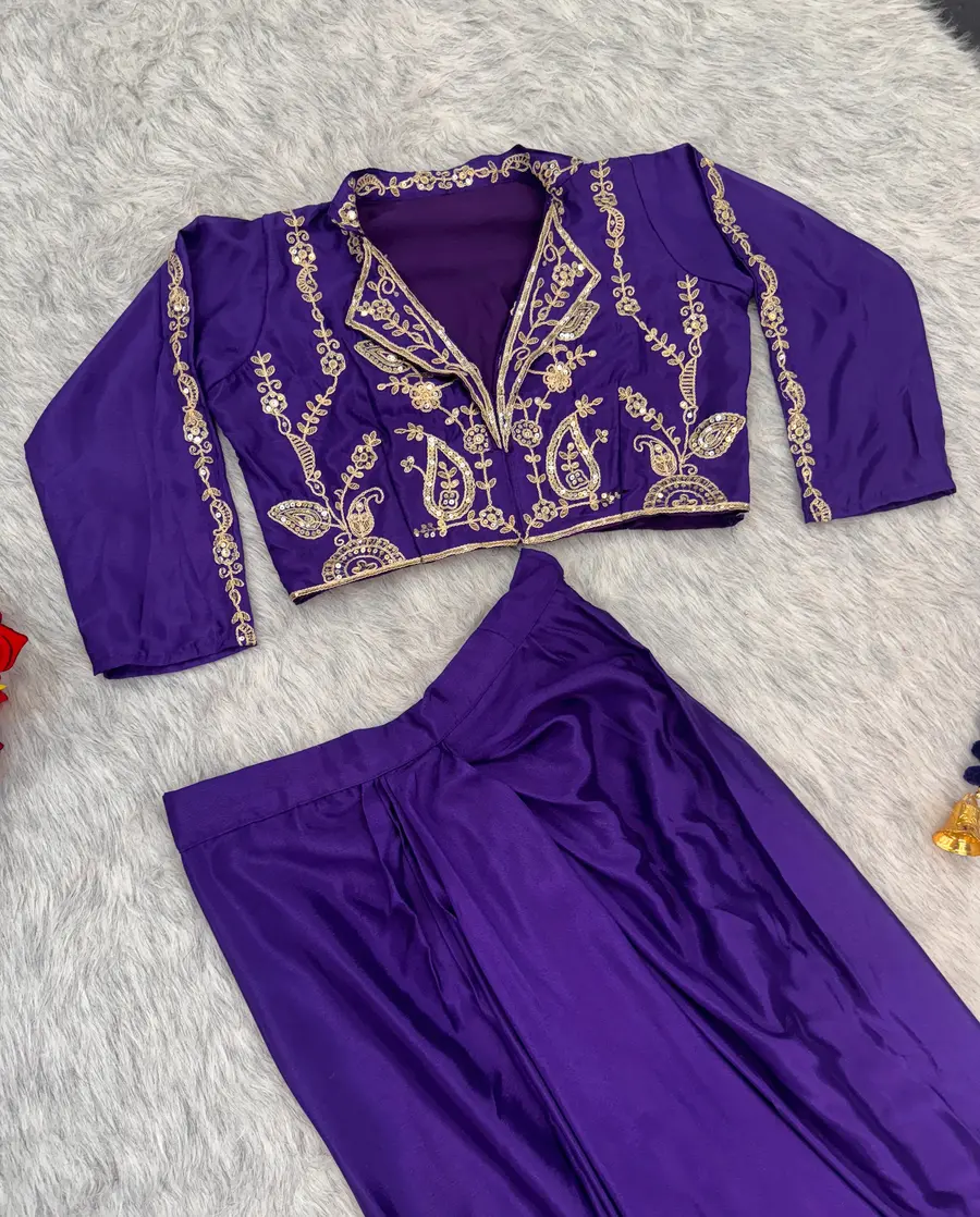 MODERN CHINON SILK EMBROIDERY SEQUENCE CODING WORK DRAPE SKIRT WITH BLOUSE PURPLE