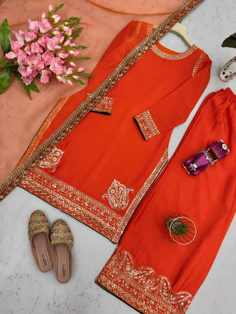 MODERN CHINON SILK EMBROIDERY SEQUENCE WORK TOP PALAZZO WITH DUPATTA ORANGE