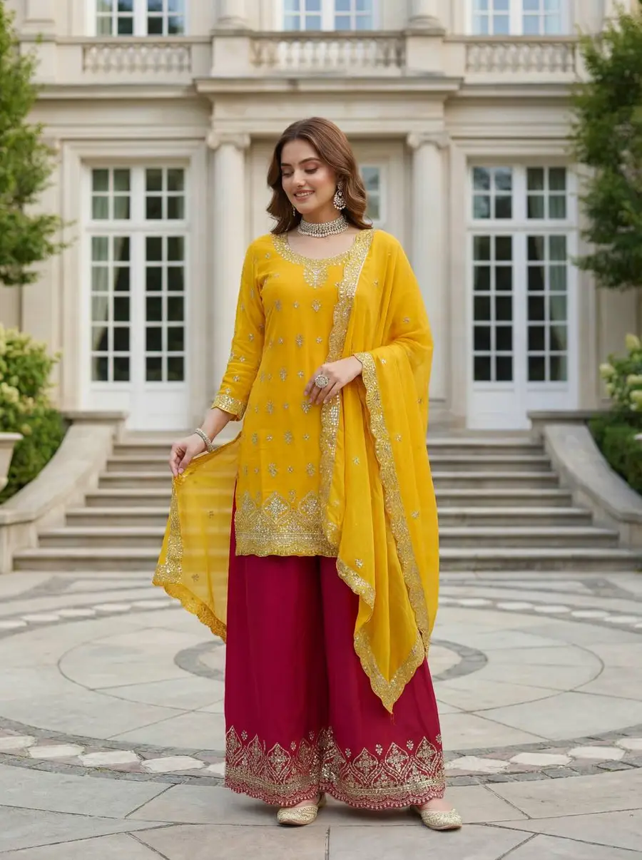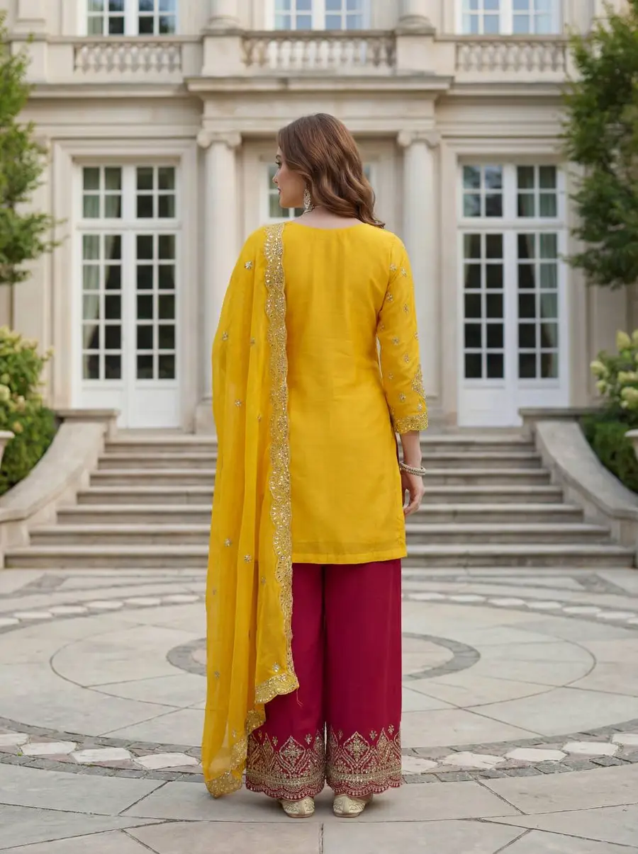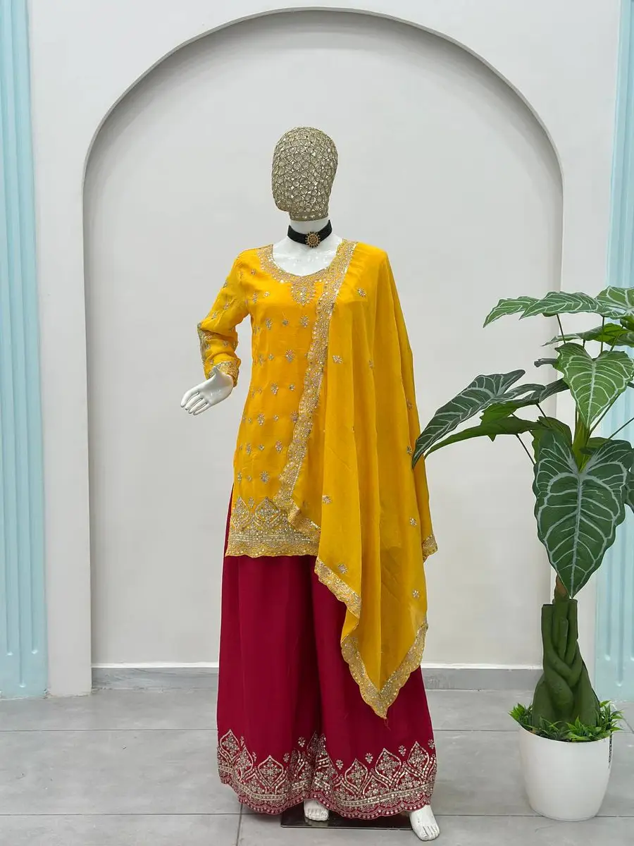 MODERN CHINON SILK EMBROIDERY SEQUENCE ZARI WORK TOP PALAZZO WITH DUPATTA YELLOW AND RANI