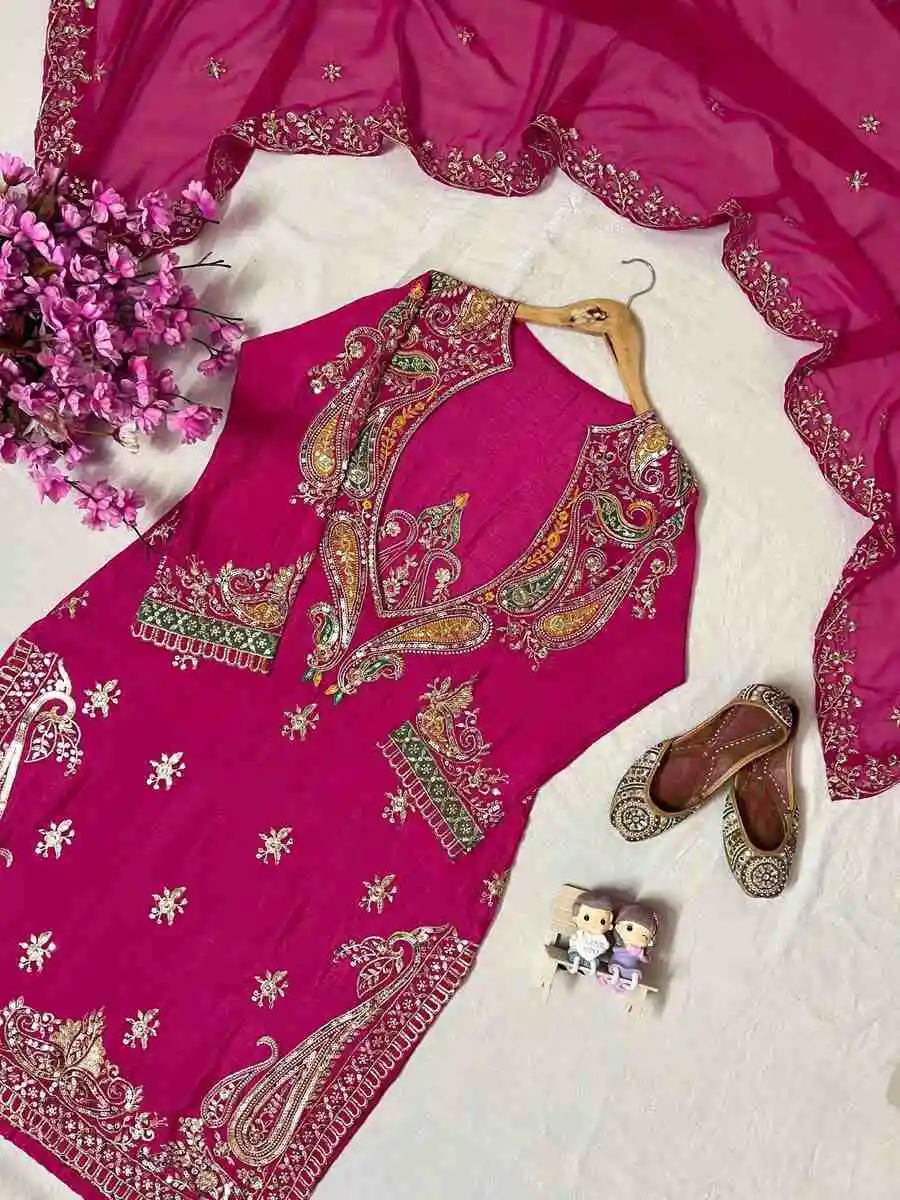 MODERN CHINON SILK THREAD & SEQUENCE EMBROIDERY WORK TOP, BLOUSE ,BOTTOM AND WITH DUPATTA PINK