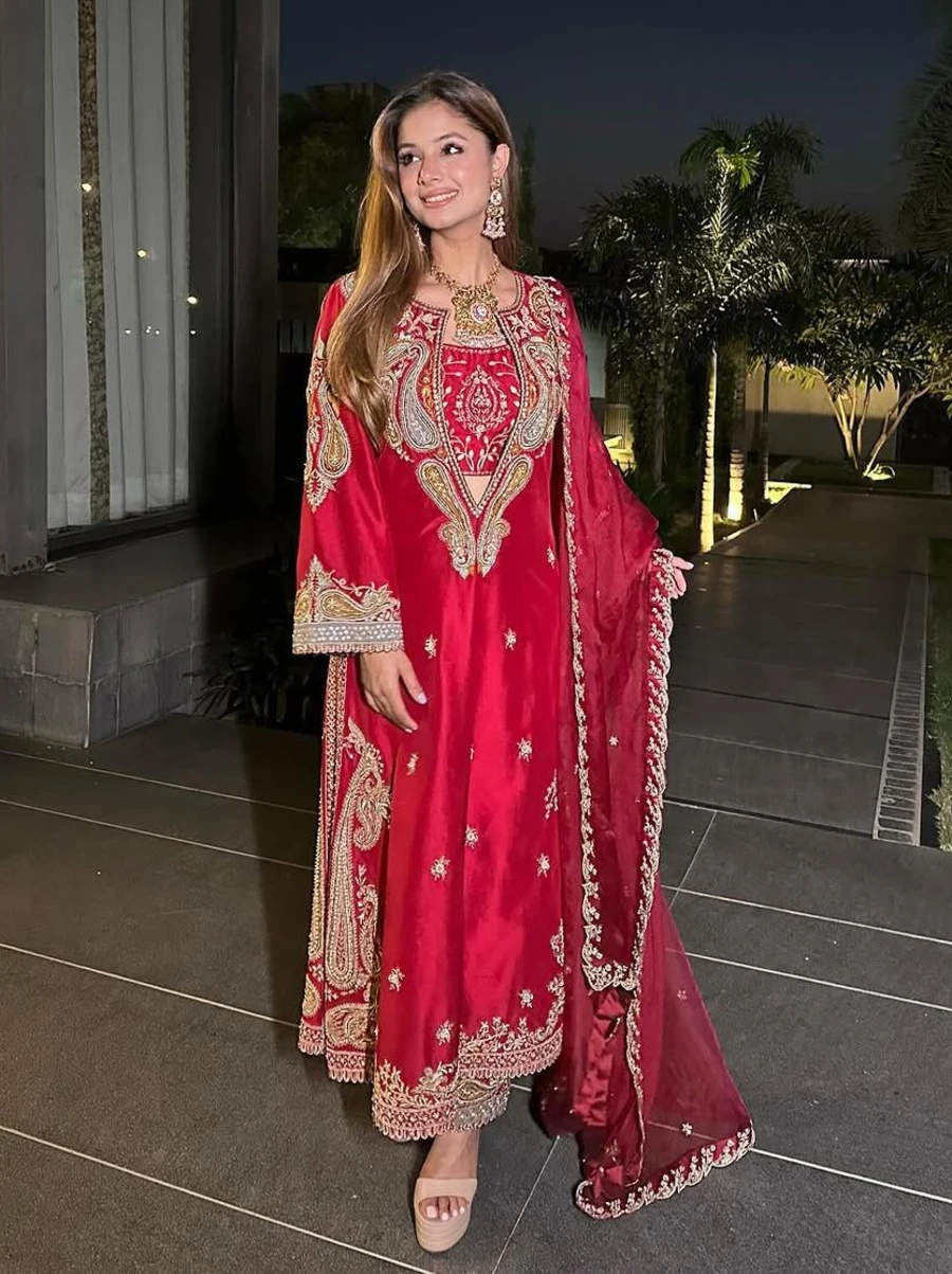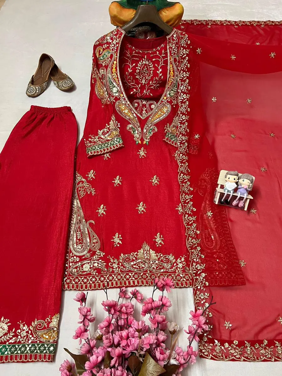 MODERN CHINON SILK THREAD & SEQUENCE EMBROIDERY WORK TOP, BLOUSE ,BOTTOM AND WITH DUPATTA RED