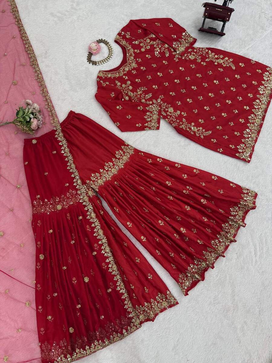 MODERN CHINON SILK THREAD WITH SEQUENCE WORK TOP SHARARA WITH DUPATTA RED