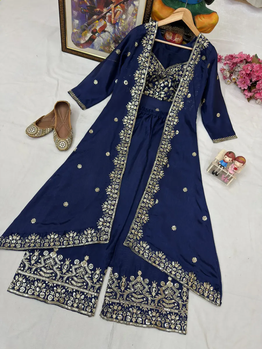 MODERN CHINON SILK ZARI & 5 MM SEQUENCE EMBROIDERY WORK BLOUSE SHRUG AND PALAZZO SET NAVY BLUE