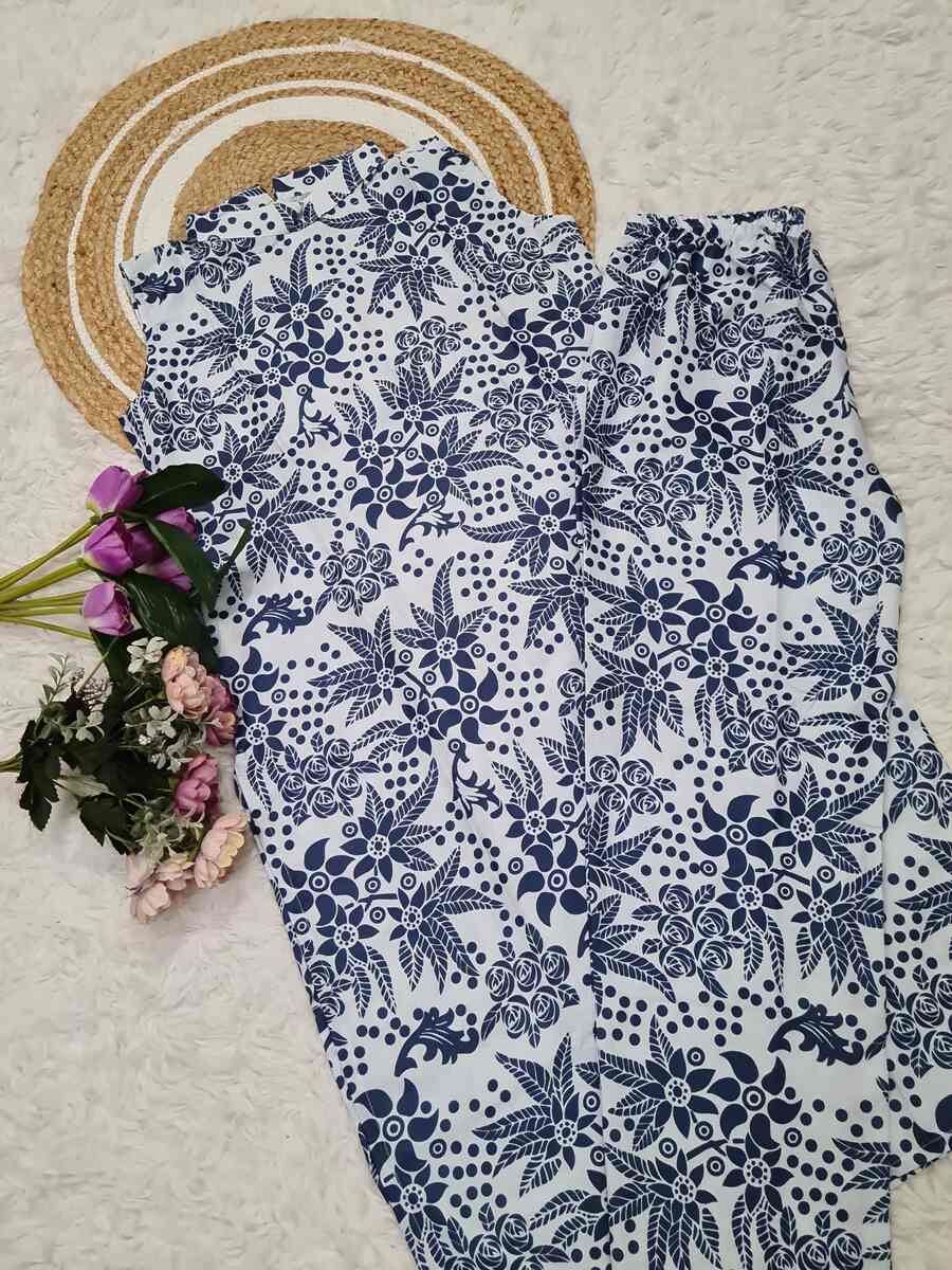 MODERN COTTON DIGITAL PRINTED WORK TOP BOTTOM SET BLUE