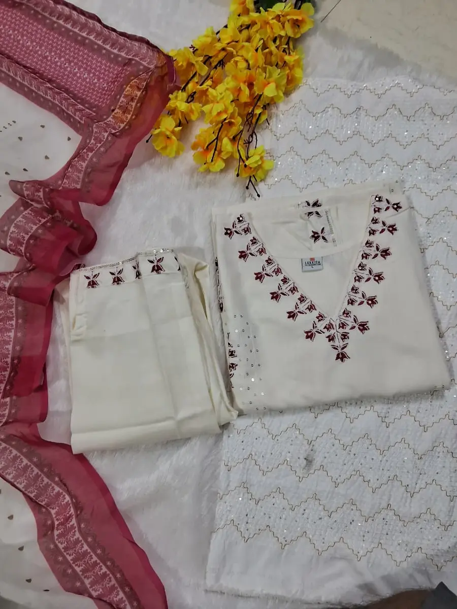 MODERN COTTON EMBROIDERY SEQUENCE WORK TOP BOTTOM WITH DUPATTA MAROON