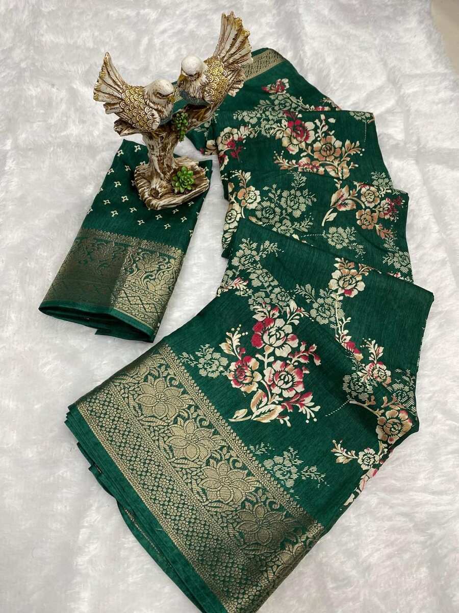 MODERN COTTON KALAMKARI PRINT JACQUARD KANJIVARAM ZARI BORDER SAREE WITH UNSTITCHED BLOUSE GREEN