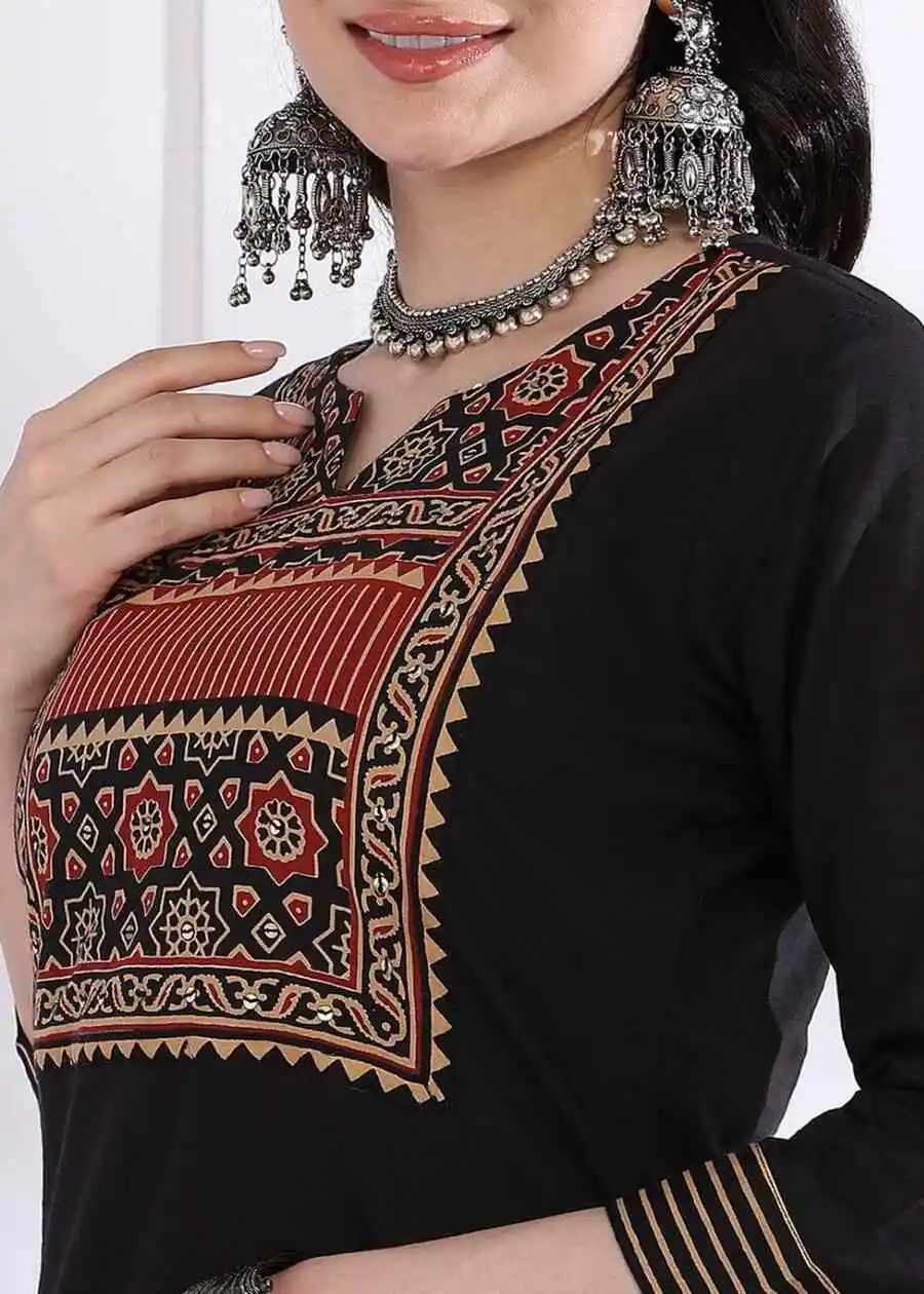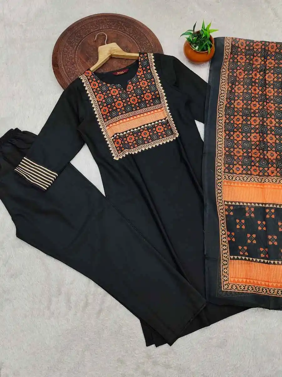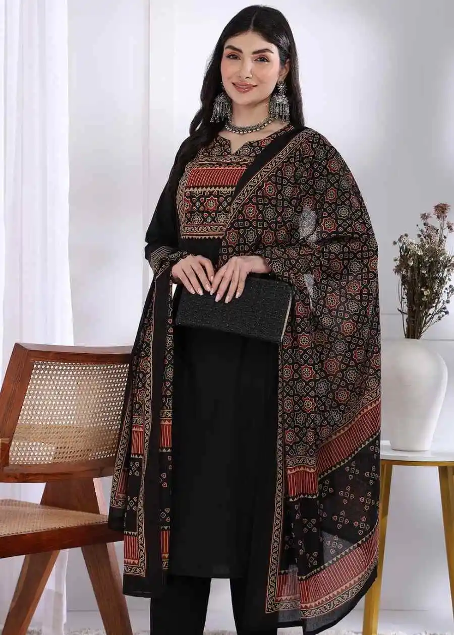 MODERN COTTON SLUB PRINTED WORK TOP BOTTOM WITH DUPATTA BLACK