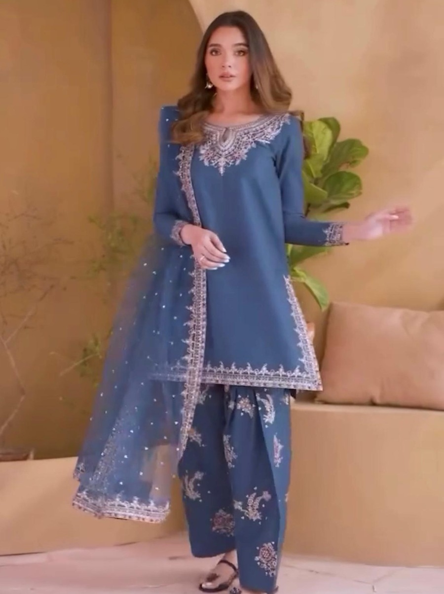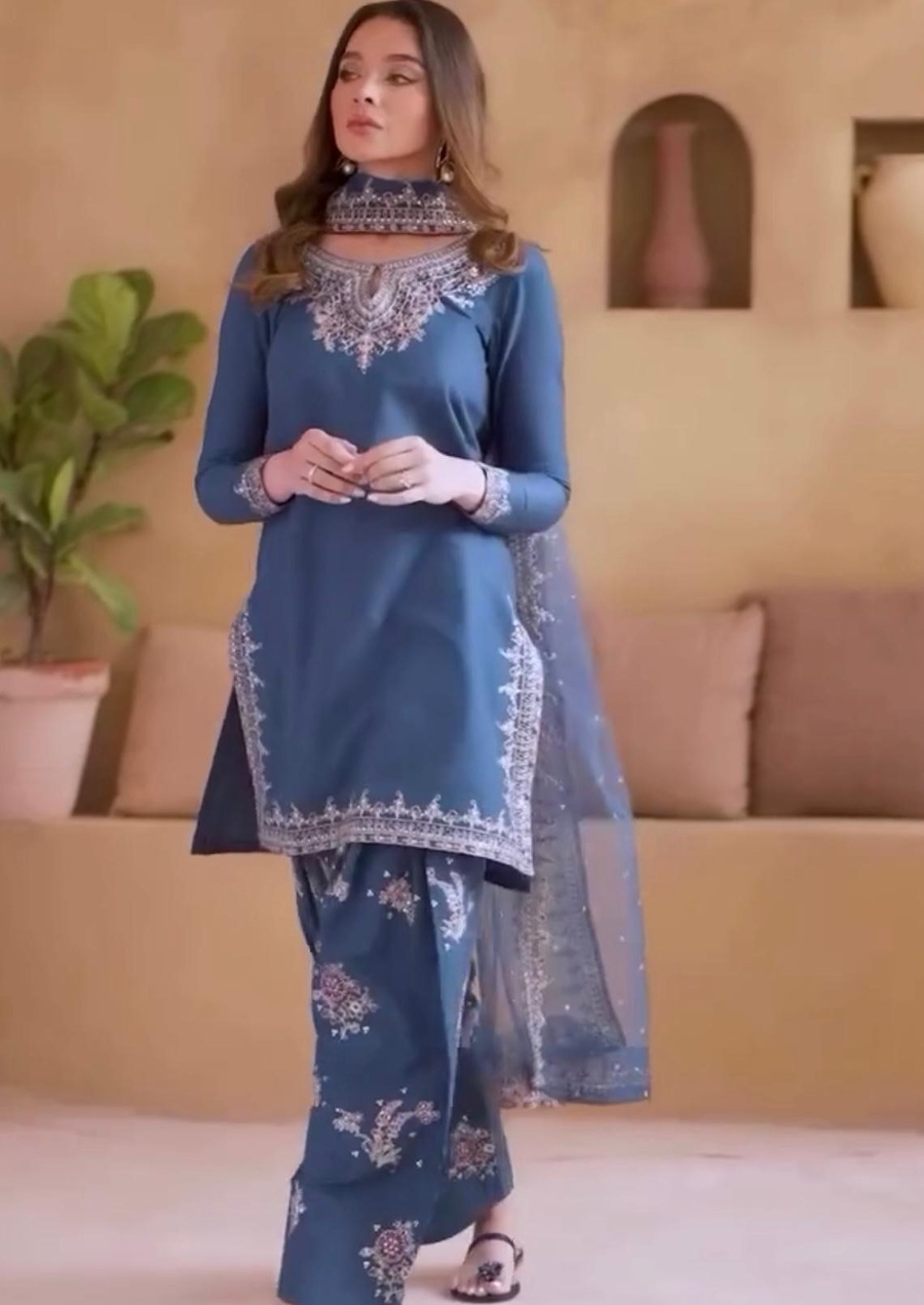 MODERN CREPE EMBROIDERY SEQUENCE WORK TOP PATIYALA WITH DUPATTA BLUE