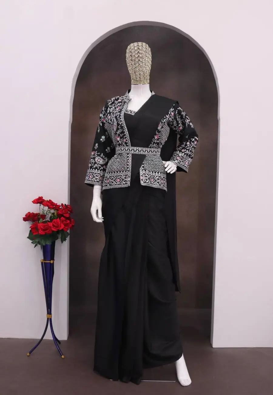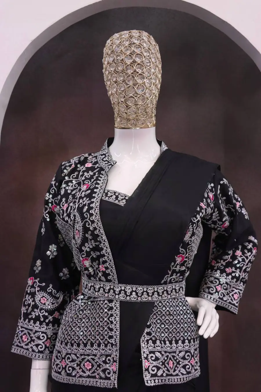 MODERN CREPE SILK PLAIN READY TO WEAR SAREE WITH EMBROIDERY SEQUENCE WORK KOTI AND BLOUSE BLACK