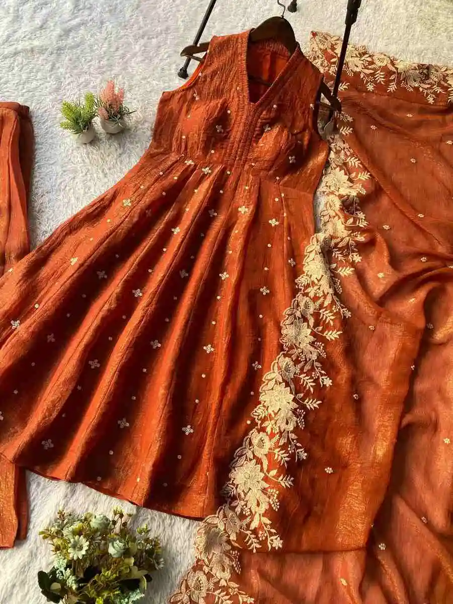 MODERN CRUNCHY EMBROIDERY WORK TOP PALAZZO WITH DUPATTA ORANGE