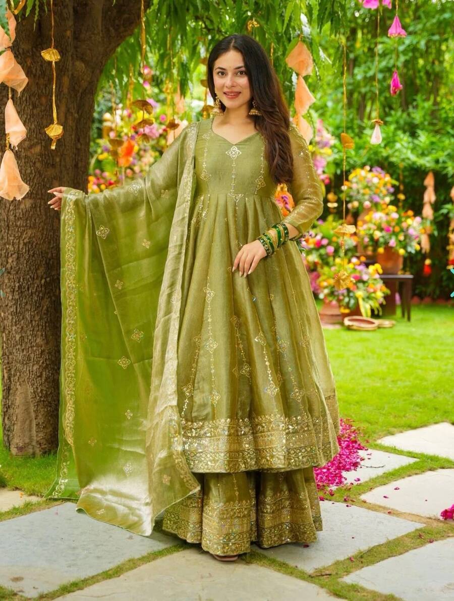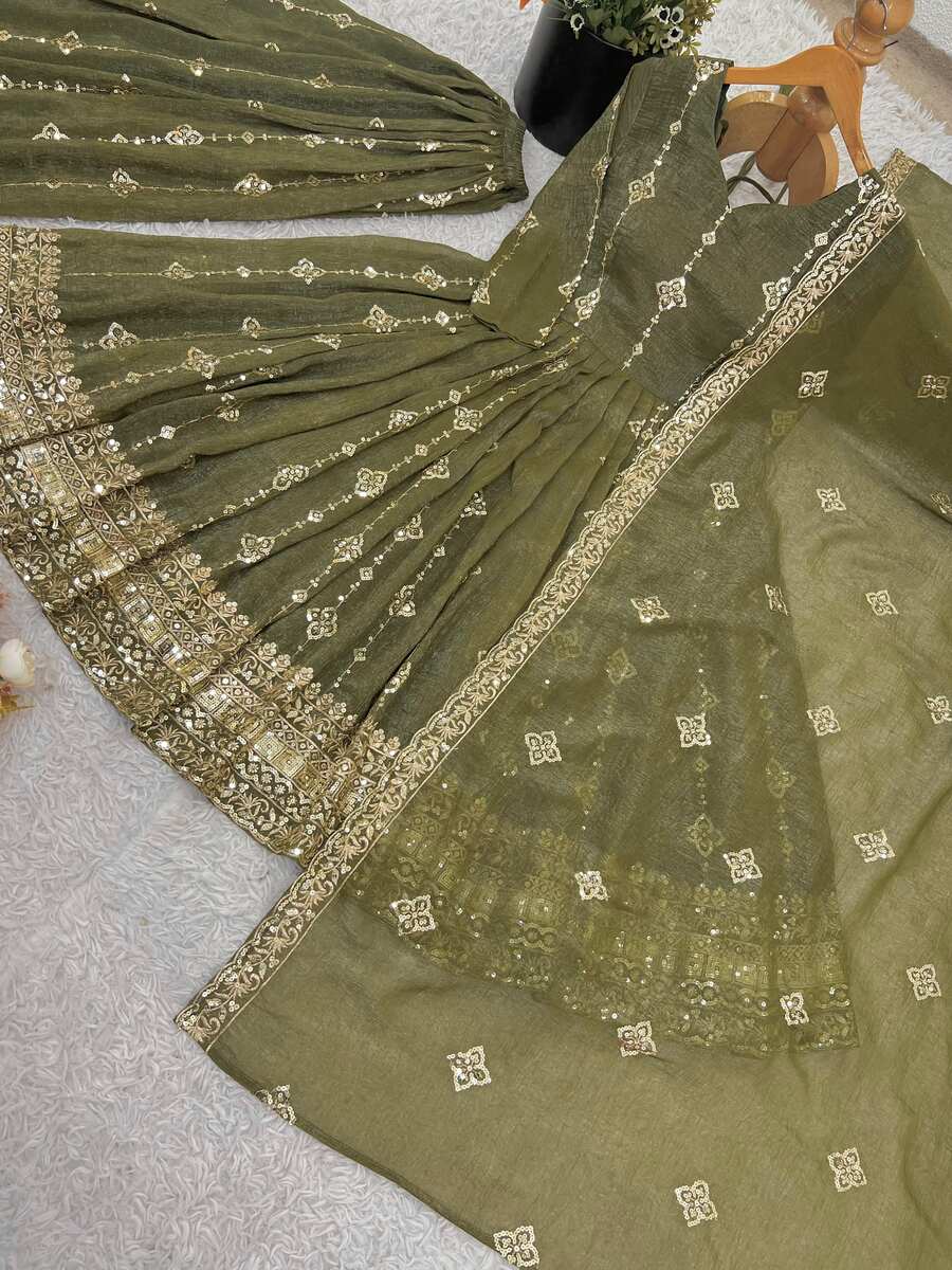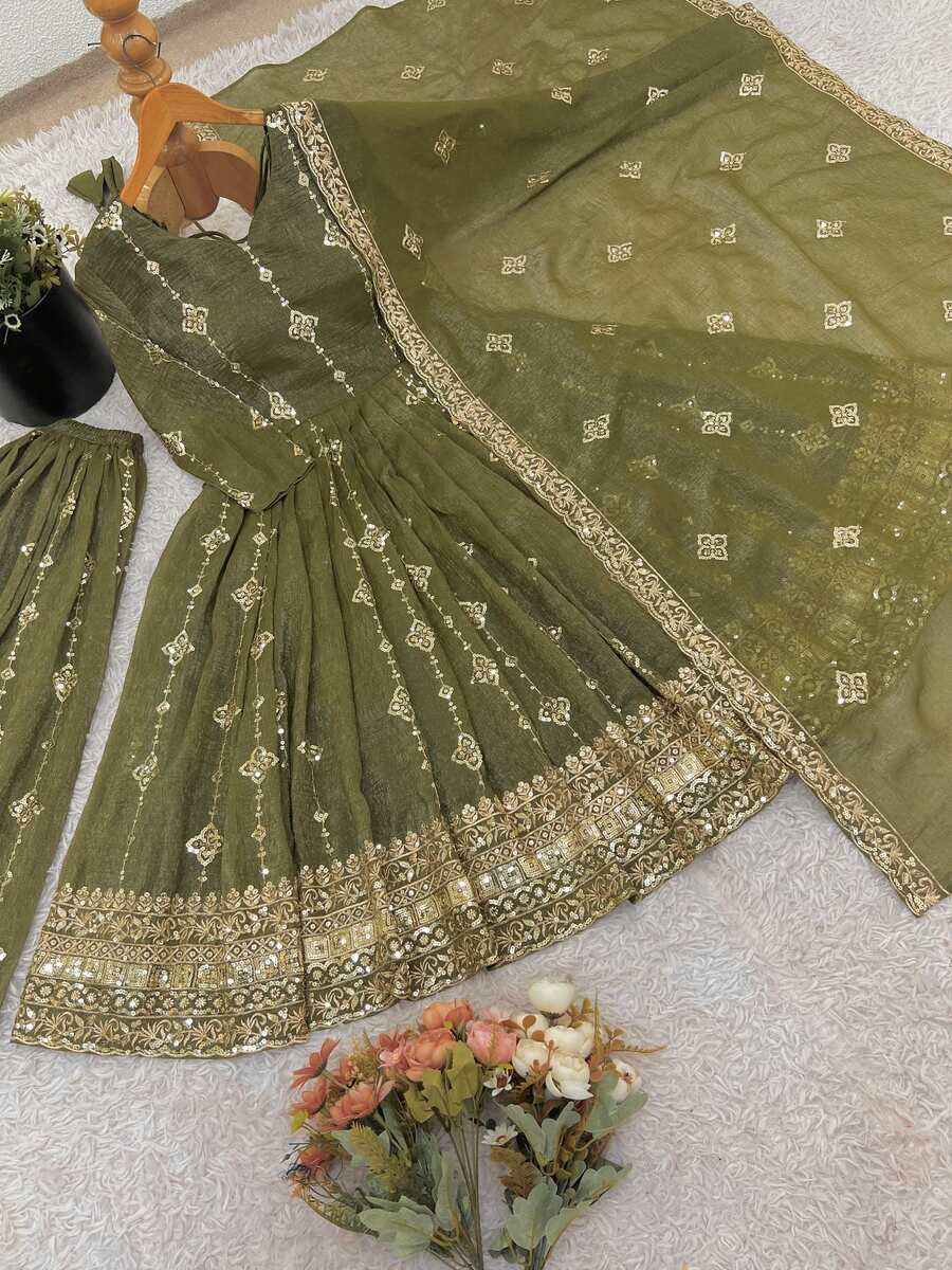 MODERN CRUNCHY SILK EMBROIDERY SEQUENCE WORK GOWN PALAZZO WITH DUPATTA GREEN