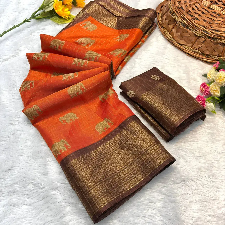 MODERN DOLA SILK JACQUARD WEAVING BORDER AND HD BATIK PRINT WORK SAREE WITH UNSTITCHED BLOUSE ORANGE