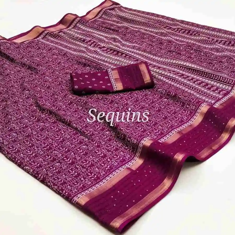 MODERN DOLA SILK ZARI WEAVING AND SEQUENCE WORK BORDER AND KALAMKARI PRINT WORK SAREE WITH UNSTITCHED BLOUSE WINE