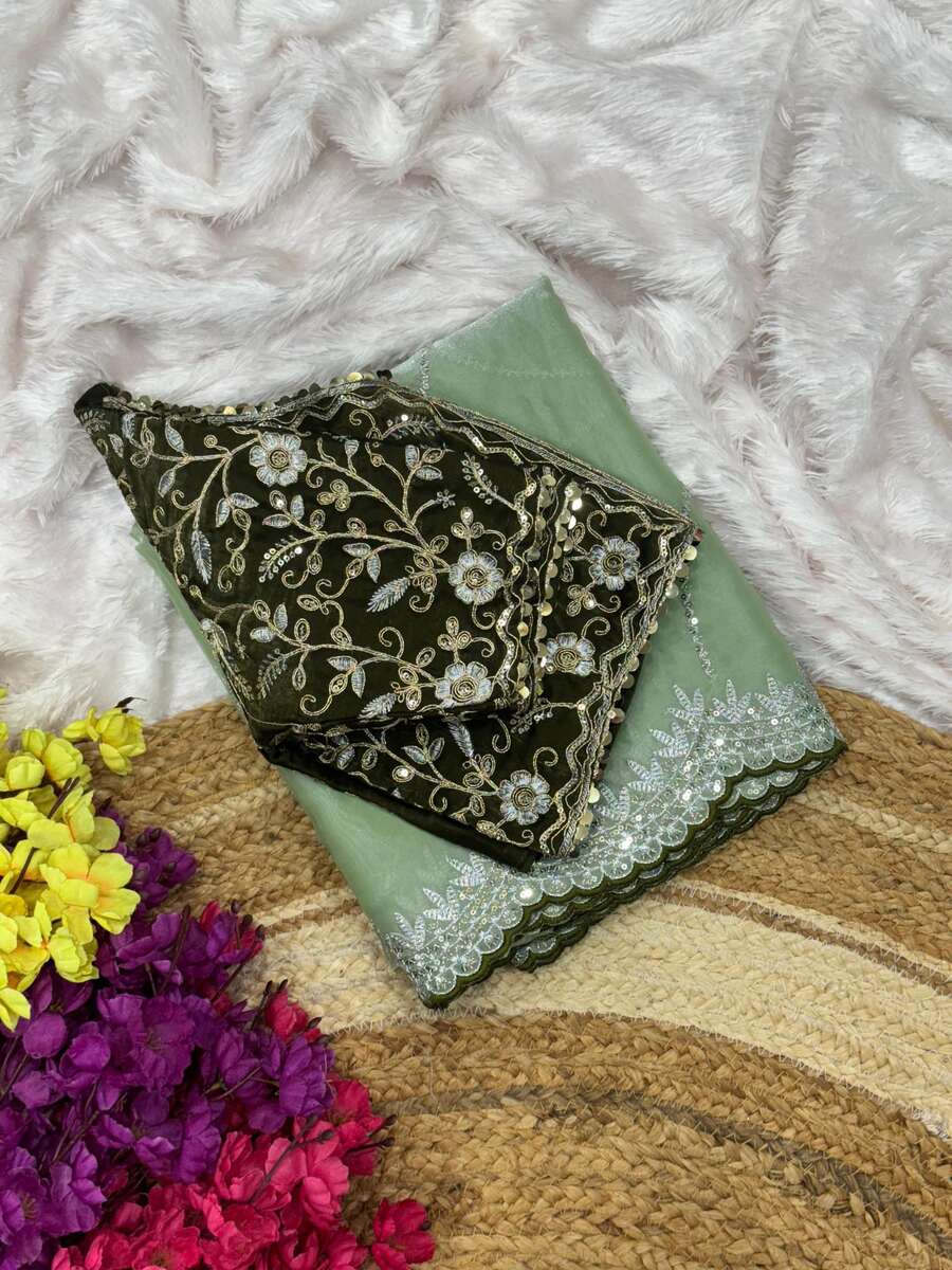MODERN EMBROIDERY WORK SEQUENCE AND JARI WITH ARC BORDER JIMMY CHOO SAREE WITH STITCHED BLOUSE GREEN