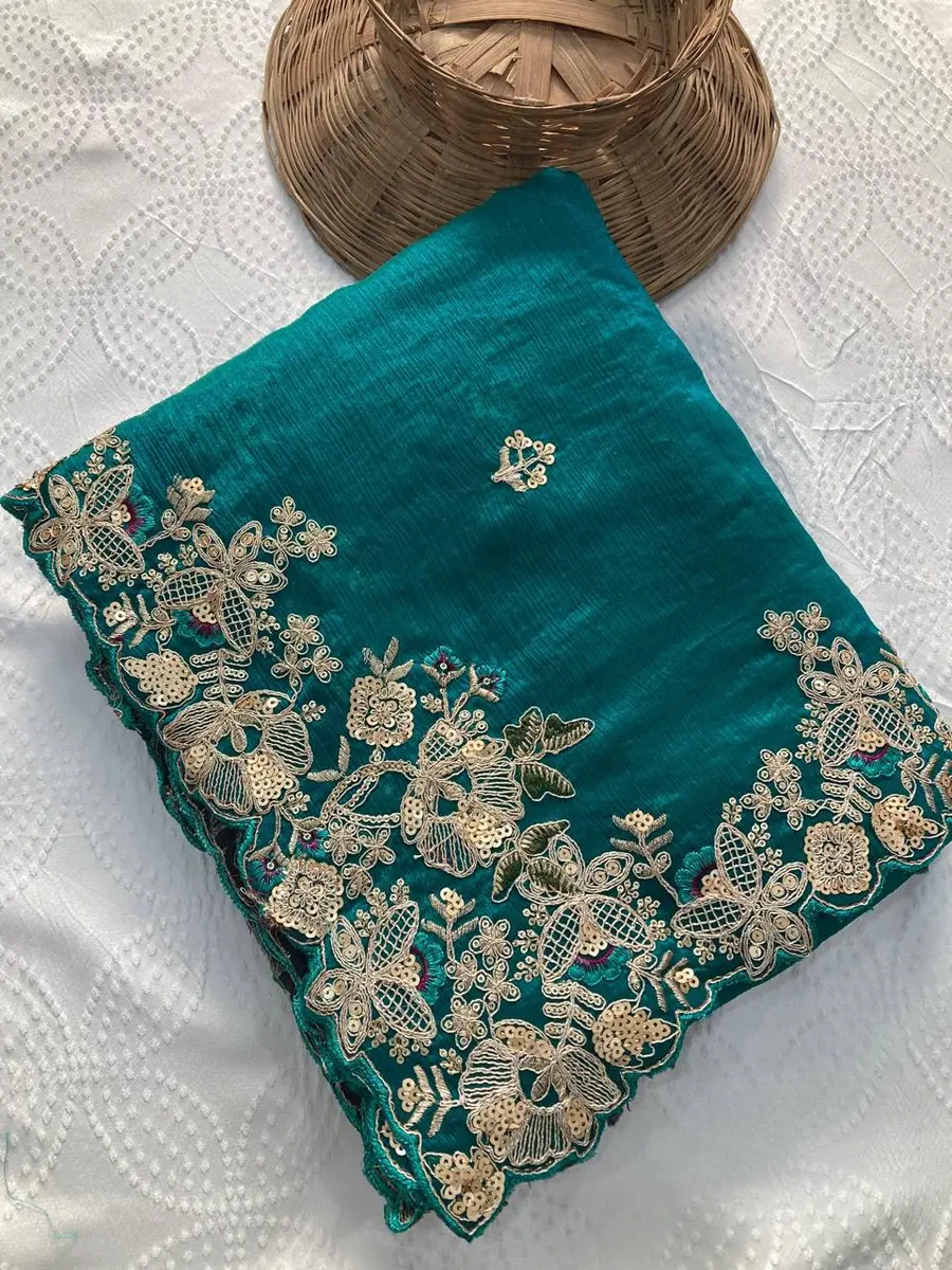 SAREE FABRIC : PURE SOFT JIMMY CHOO WITH HEAVY EMBROIDERY MULTI TREADS , CODING & SEQUENCE WORK & FANCY CUT WORK BORDER