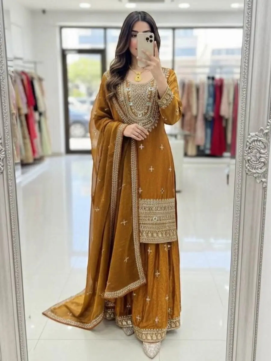 MODERN FENDY SILK EMBROIDERY SEQUENCE WORK WITH REAL MIRROR HAND WORK TOP SHARARA WITH DUPATTA MUSTARD