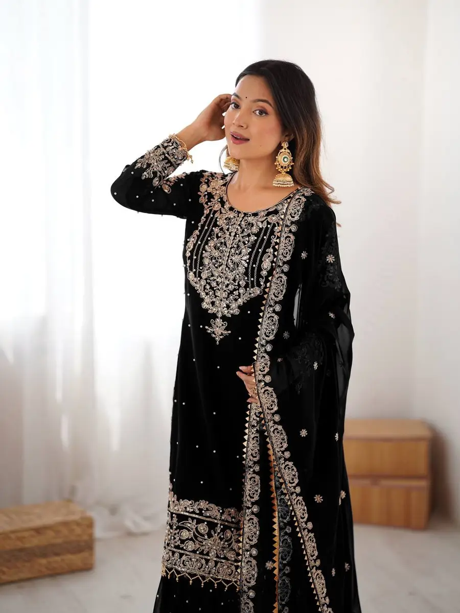 MODERN GEORGETTE CODING DORI EMBROIDERY WITH SEQUENCE & THREAD AND PEARL WORK TOP SHARARA WITH DUPATTA BLACK