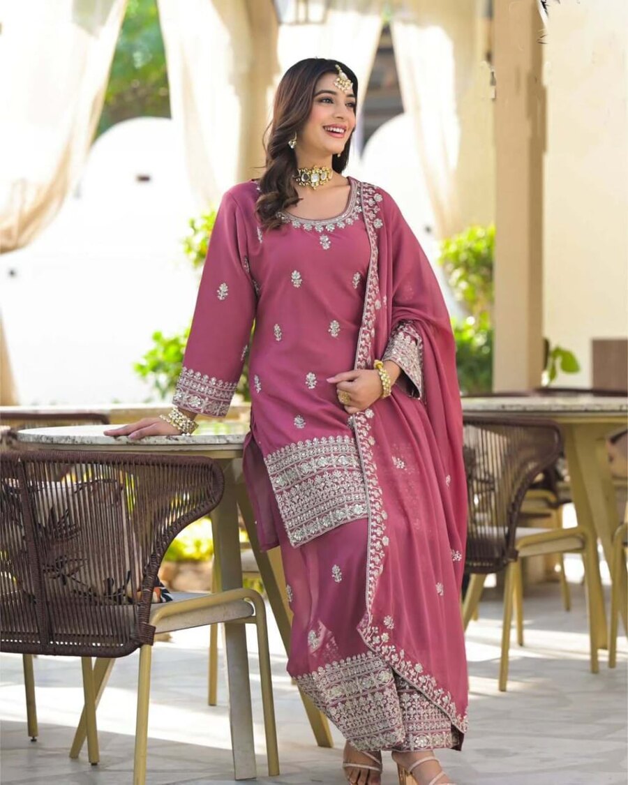 MODERN GEORGETTE EMBROIDERY CODING SEQUENCE WITH REAL MIRROR WORK TOP PALAZZO WITH DUPATTA PINK