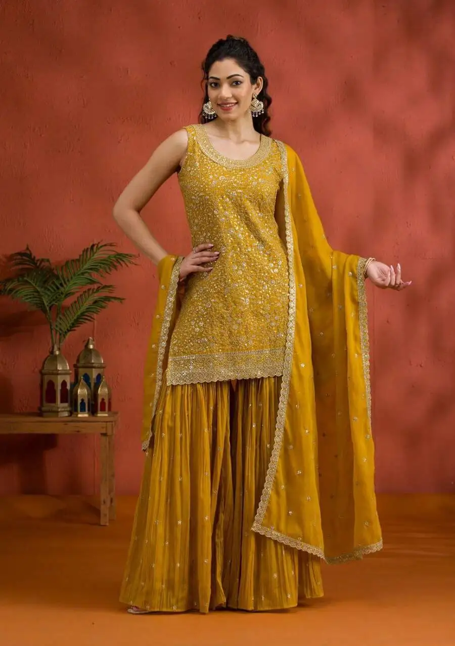 MODERN GEORGETTE EMBROIDERY SEQUENCE WORK TOP SHARARA WITH DUPATTA YELLOW