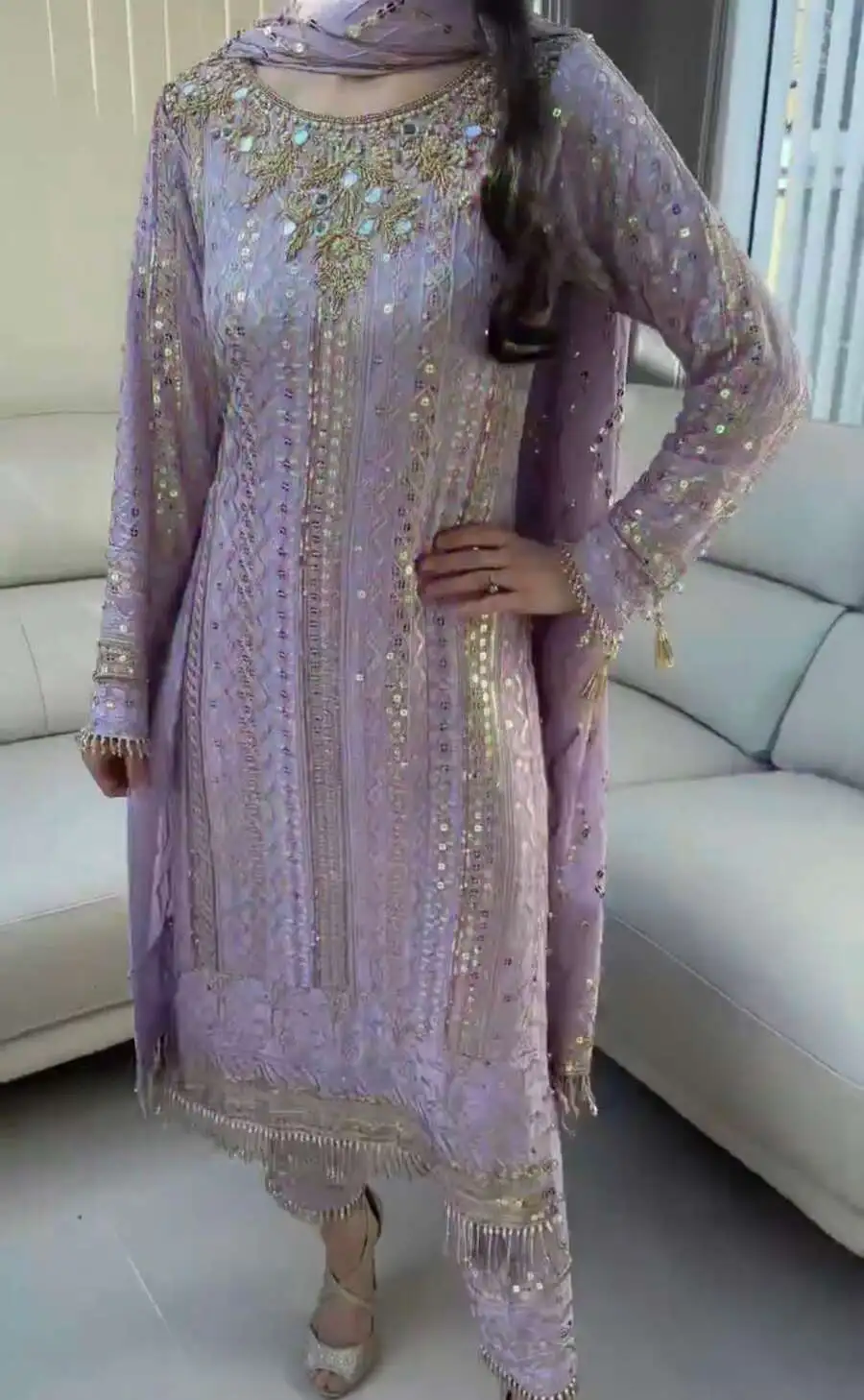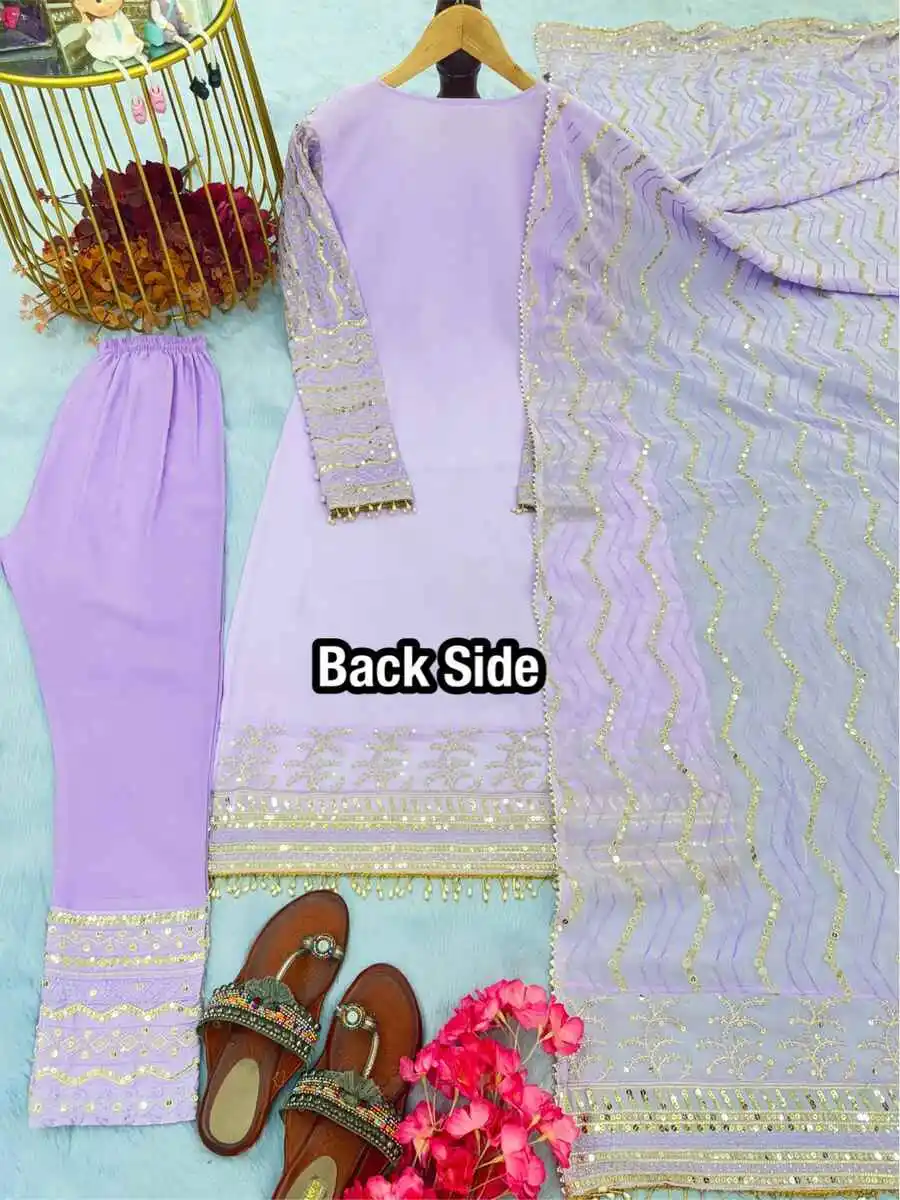 MODERN GEORGETTE EMBROIDERY SEQUENCE WORK WITH PEARL MOTI & REAL MIRROR HAND WORK TOP BOTTOM WITH DUPATTA LAVENDER